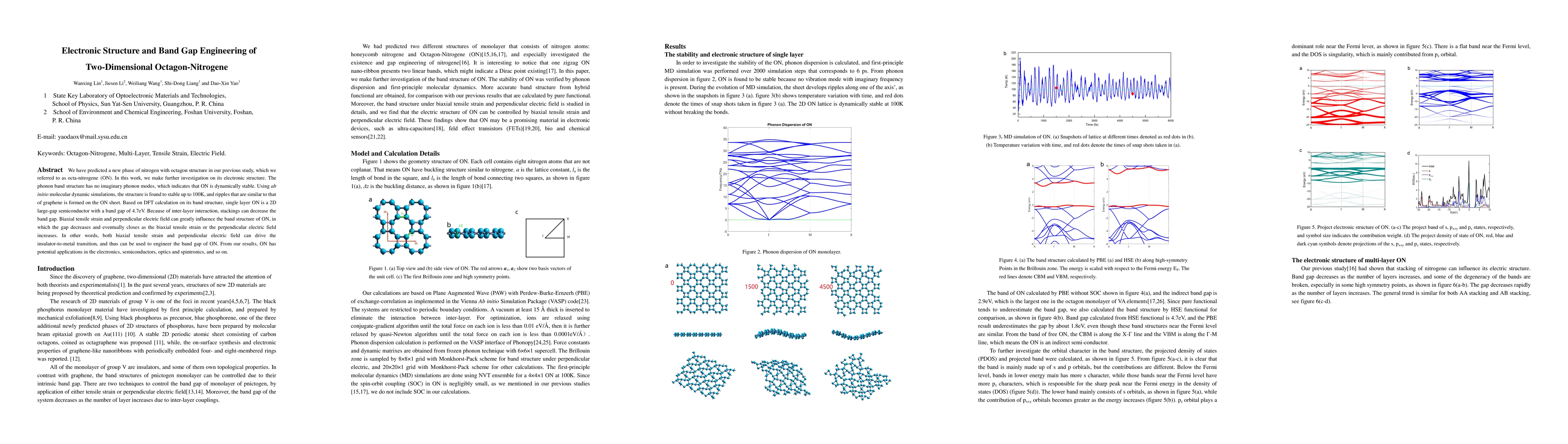 We have predicted a new phase of nitrogen with octagon structure in our previous study, which we referred to as octa-nitrogene (ON). In this work, we make further investigation on its electronic structure. The phonon band structure has no imaginary phonon modes, which indicates that ON is dynamically stable. Using ab initio molecular dynamic simulations, the structure is found to stable up to 100K, and ripples that are similar to that of graphene is formed on the ON sheet. Based on DFT calculation on its band structure, single layer ON is a 2D large-gap semiconductor with a band gap of 4.7eV. Because of inter-layer interaction, stackings can decrease the band gap. Biaxial tensile strain and perpendicular electric field can greatly influence the band structure of ON, in which the gap decreases and eventually closes as the biaxial tensile strain or the perpendicular electric field increases. In other words, both biaxial tensile strain and perpendicular electric field can drive the insulator-to-metal transition, and thus can be used to engineer the band gap of ON. From our results, ON has potential applications in the electronics, semiconductors, optics and spintronics, and so on.