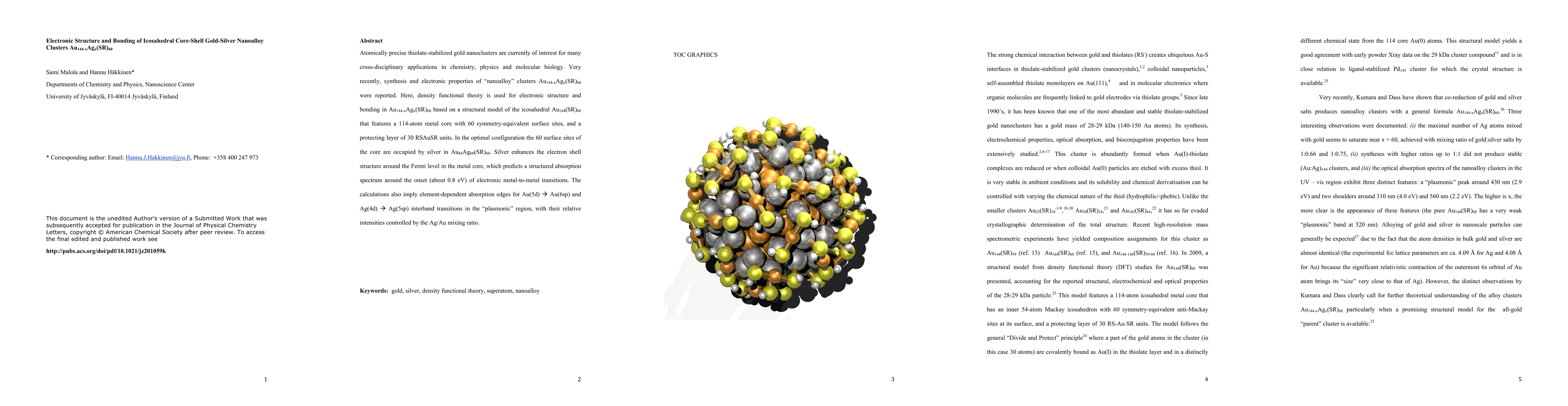 Atomically precise thiolate-stabilized gold nanoclusters are currently of interest for many cross-disciplinary applications in chemistry, physics and molecular biology. Very recently, synthesis and electronic properties of "nanoalloy" clusters Au_(144-x)Ag_x(SR)_60 were reported. Here, density functional theory is used for electronic structure and bonding in Au_(144-x)Ag_x(SR)_60 based on a structural model of the icosahedral Au_144(SR)_60 that features a 114-atom metal core with 60 symmetry-equivalent surface sites, and a protecting layer of 30 RSAuSR units. In the optimal configuration the 60 surface sites of the core are occupied by silver in Au_84Ag_60(SR)_60. Silver enhances the electron shell structure around the Fermi level in the metal core, which predicts a structured absorption spectrum around the onset (about 0.8 eV) of electronic metal-to-metal transitions. The calculations also imply element-dependent absorption edges for Au(5d) \rightarrow Au(6sp) and Ag(4d) \rightarrow Ag(5sp) interband transitions in the "plasmonic" region, with their relative intensities controlled by the Ag/Au mixing ratio.