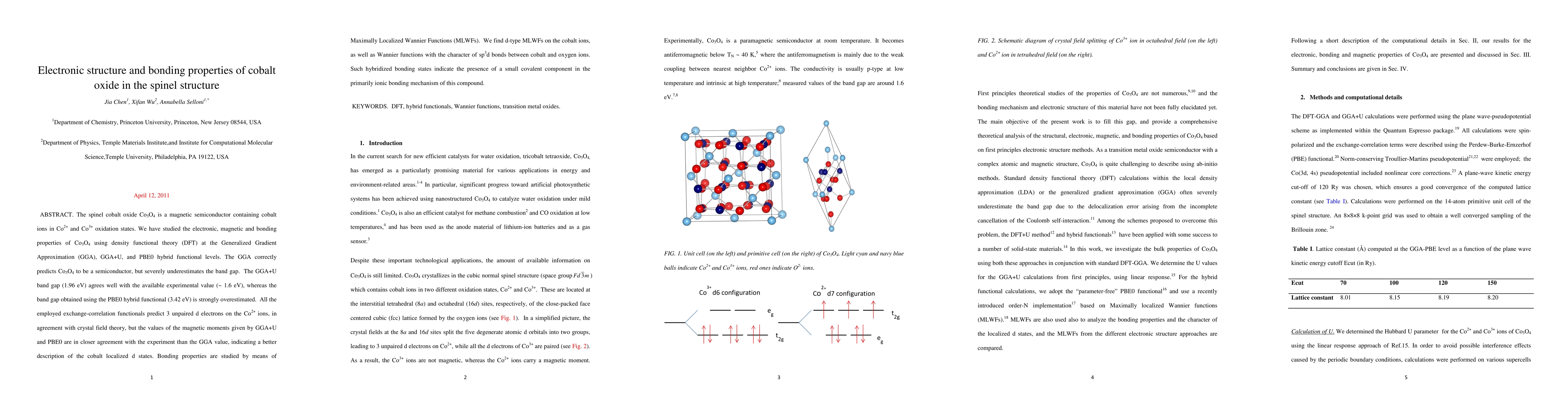 This study investigates the electronic and magnetic properties of spinel cobalt oxide Co3O4 using DFT methods, finding that GGA+U provides a more accurate band gap estimation compared to GGA and PBE0. The research also reveals a small covalent component in the primarily ionic bonding mechanism through the analysis of Maximally Localized Wannier Functions.