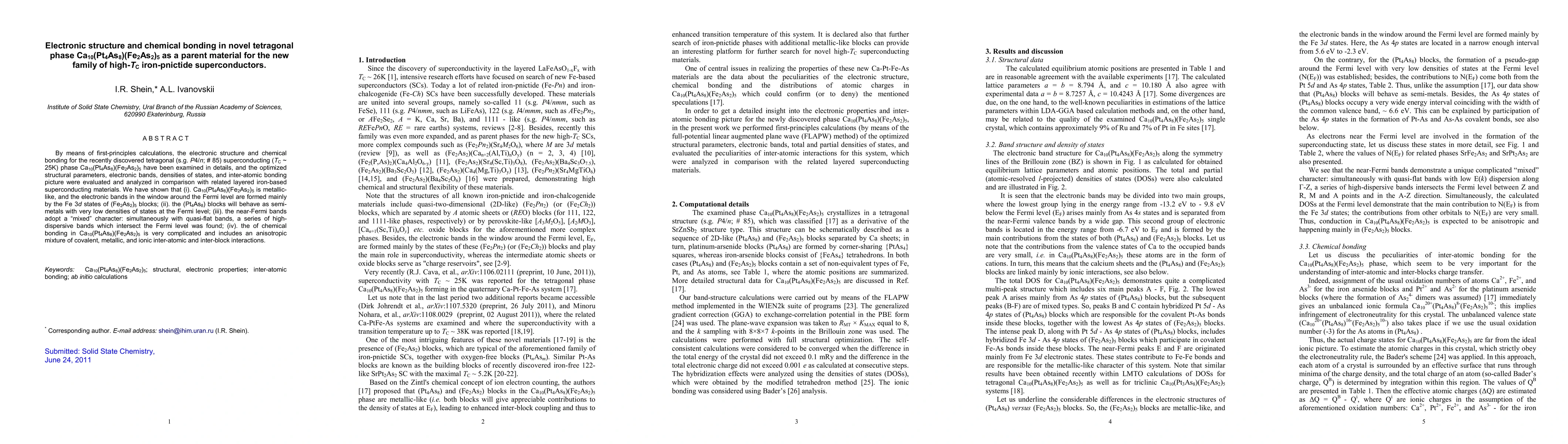 This research investigates the electronic structure and chemical bonding of the novel tetragonal superconducting phase Ca10(Pt4As8)(Fe2As2)5 using first-principles calculations. The study reveals a metallic-like nature with Fe 3d states forming the electronic bands near the Fermi level, and a complex bonding character involving a mix of covalent, metallic, and ionic interactions.