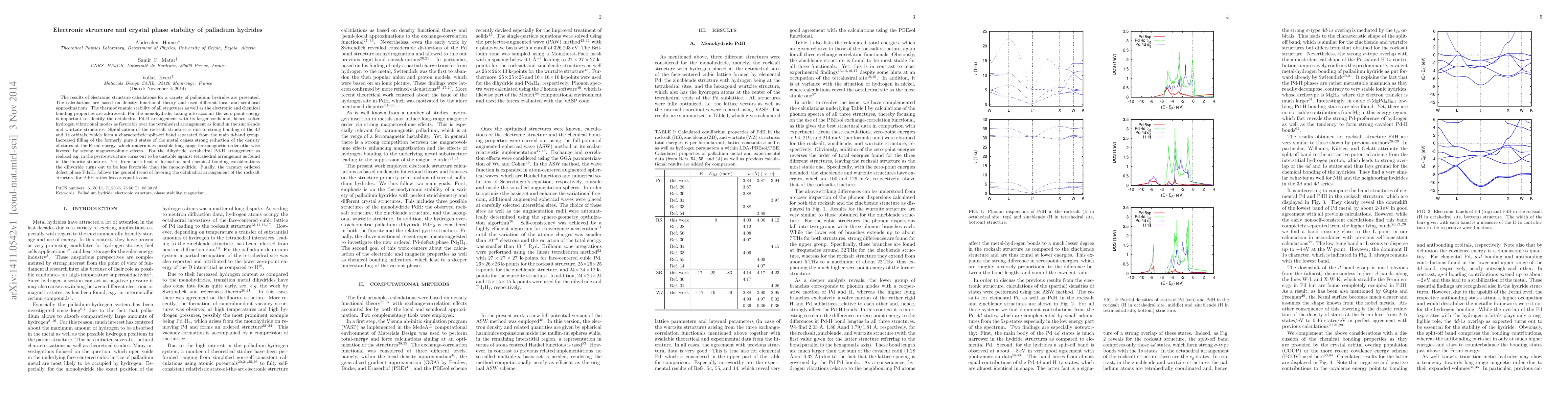 This study uses density functional theory to investigate the electronic structure and thermodynamic stability of various palladium hydrides. The monohydride favors an octahedral Pd-H arrangement due to zero-point energy considerations, while the dihydride prefers a tetrahedral arrangement, making it less stable than the monohydride.