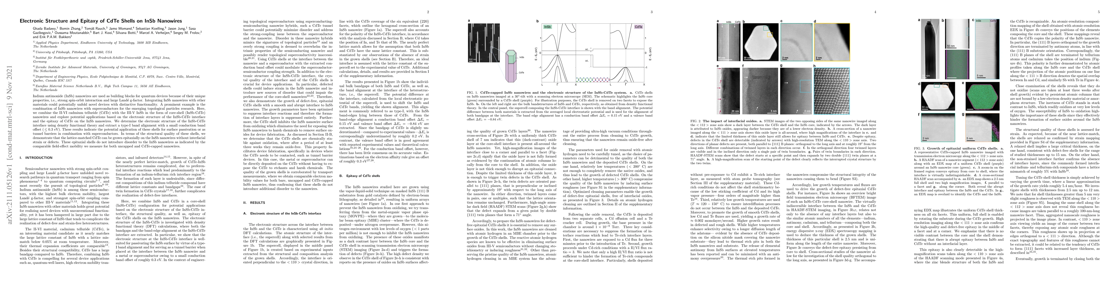 Indium antimonide (InSb) nanowires are used as building blocks for quantum devices because of their unique properties, i.e., strong spin-orbit interaction and large Land\'e g-factor. Integrating InSb nanowires with other materials could potentially unfold novel devices with distinctive functionality. A prominent example is the combination of InSb nanowires with superconductors for the emerging topological particles research. Here, we combine the II-VI cadmium telluride (CdTe) with the III-V InSb in the form of core-shell (InSb-CdTe) nanowires and explore potential applications based on the electronic structure of the InSb-CdTe interface and the epitaxy of CdTe on the InSb nanowires. We determine the electronic structure of the InSb-CdTe interface using density functional theory and extract a type-I band alignment with a small conduction band offset ($\leq$ 0.3 eV). These results indicate the potential application of these shells for surface passivation or as tunnel barriers in combination with superconductors. In terms of the structural quality of these shells, we demonstrate that the lattice-matched CdTe can be grown epitaxially on the InSb nanowires without interfacial strain or defects. These epitaxial shells do not introduce disorder to the InSb nanowires as indicated by the comparable field-effect mobility we measure for both uncapped and CdTe-capped nanowires.
