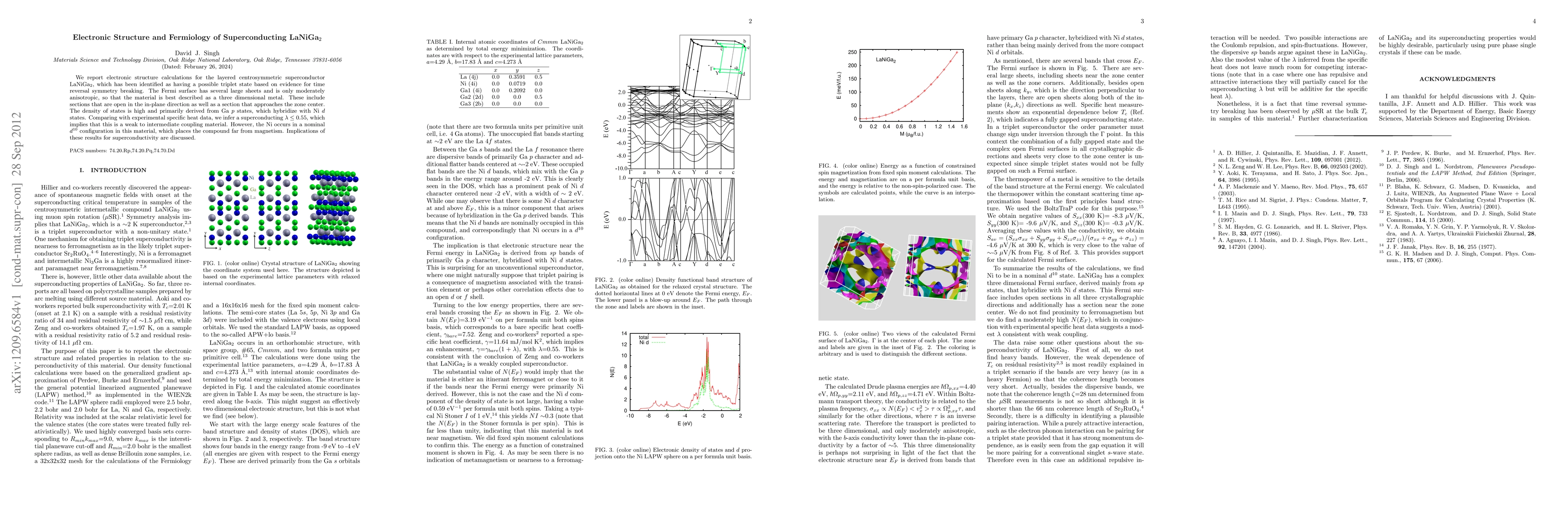We report electronic structure calculations for the layered centrosymmetric superconductor LaNiGa$_2$, which has been identified as having a possible triplet state based on evidence for time reversal symmetry breaking. The Fermi surface has several large sheets and is only moderately anisotropic, so that the material is best described as a three dimensional metal. These include sections that are open in the in-plane direction as well as a section that approaches the zone center. The density of states is high and primarily derived from Ga $p$ states, which hybridize with Ni $d$ states. Comparing with experimental specific heat data, we infer a superconducting $\lambda \le$ 0.55, which implies that this is a weak to intermediate coupling material. However, the Ni occurs in a nominal $d^{10}$ configuration in this material, which places the compound far from magnetism. Implications of these results for superconductivity are discussed.