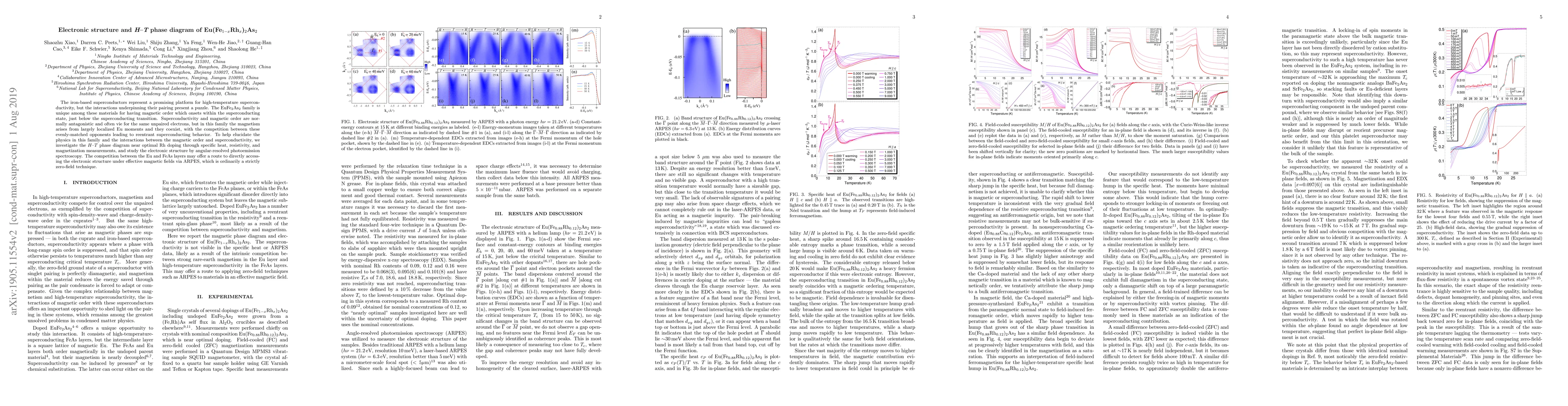 The iron-based superconductors represent a promising platform for high-temperature superconductivity, but the interactions underpinning their pairing present a puzzle. The EuFe$_2$As$_2$ family is unique among these materials for having magnetic order which onsets within the superconducting state, just below the superconducting transition. Superconductivity and magnetic order are normally antagonistic and often vie for the same unpaired electrons, but in this family the magnetism arises from largely localized Eu moments and they coexist, with the competition between these evenly-matched opponents leading to reentrant superconducting behavior. To help elucidate the physics in this family and the interactions between the magnetic order and superconductivity, we investigate the $H$--$T$ phase diagram near optimal Rh doping through specific heat, resistivity, and magnetization measurements, and study the electronic structure by angular-resolved photoemission spectroscopy. The competition between the Eu and FeAs layers may offer a route to directly accessing the electronic structure under effective magnetic fields via ARPES, which is ordinarily a strictly zero-field technique.