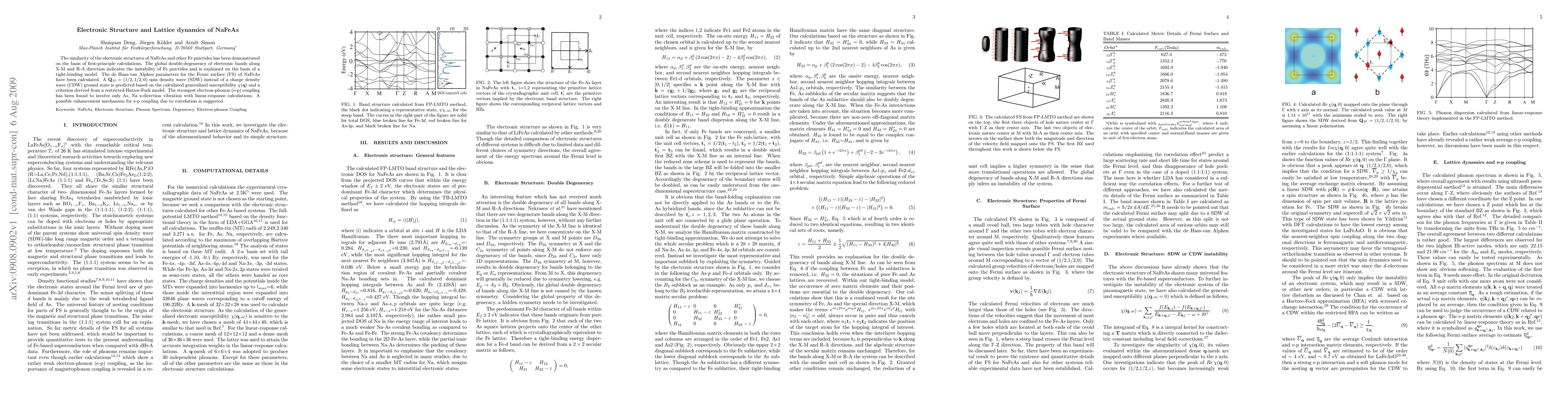 Research on NaFeAs reveals a global double-degeneracy in electronic bands and predicts a spin density wave ground state with the strongest electron-phonon coupling involving As and Na vibrations.