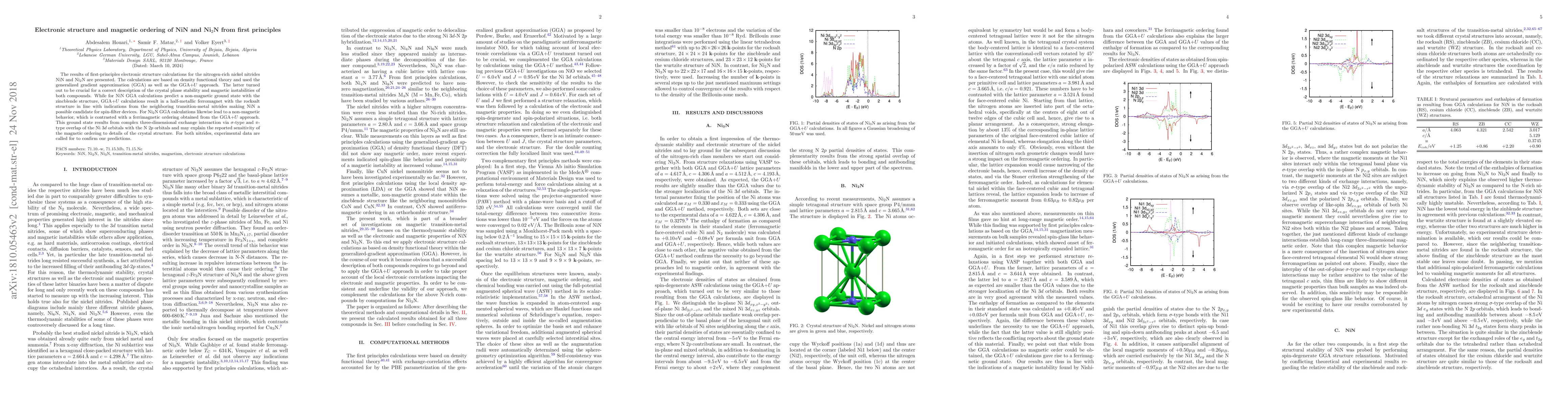 This study uses first-principles calculations based on DFT and GGA+$U$ to investigate the electronic structure and magnetic ordering of NiN and Ni$_2$N. GGA+$U$ reveals NiN to be a half-metallic ferromagnet and Ni$_2$N to be ferrimagnetic, contrasting with non-magnetic predictions from GGA alone, suggesting potential applications for spin-filter devices.