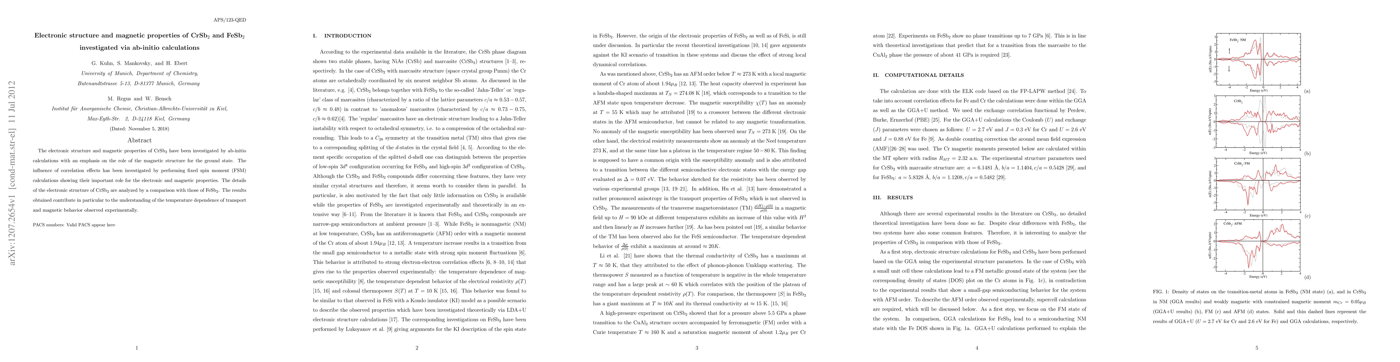 This paper investigates the electronic structure and magnetic properties of CrSb$_2$ and FeSb$_2$ using ab-initio calculations, highlighting the significant role of magnetic structure and correlation effects in the ground state. Comparative analysis with FeSb$_2$ enhances understanding of their temperature-dependent transport and magnetic behaviors.