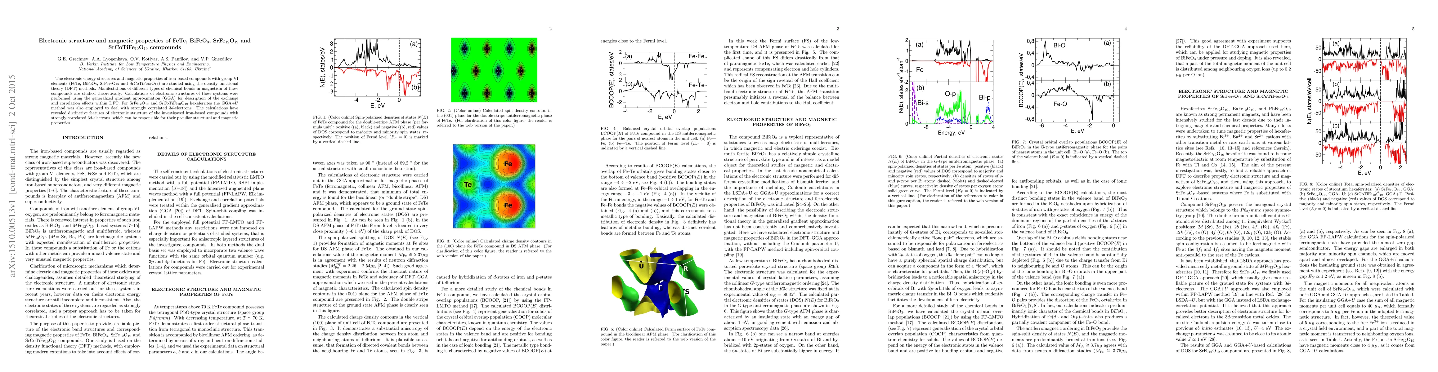 The electronic energy structures and magnetic properties of iron-based compounds with group VI elements (FeTe, BiFeO$_3$, SrFe$_{12}$O$_{19}$ and SrCoTiFe$_{10}$O$_{19}$) are studied using the density functional theory (DFT) methods. Manifestations of different types of chemical bonds in magnetism of these compounds are studied theoretically. Calculations of electronic structures of these systems were performed using the generalized gradient approximation (GGA) for description of the exchange and correlation effects within DFT. For SrFe$_{12}$O$_{19}$ and SrCoTiFe$_{10}$O$_{19}$ hexaferrites the GGA+$U$ method was also employed to deal with strongly correlated 3$d$-electrons. The calculations have revealed distinctive features of electronic structure of the investigated iron-based compounds with strongly correlated 3$d$-electrons, which can be responsible for their peculiar structural and magnetic properties.