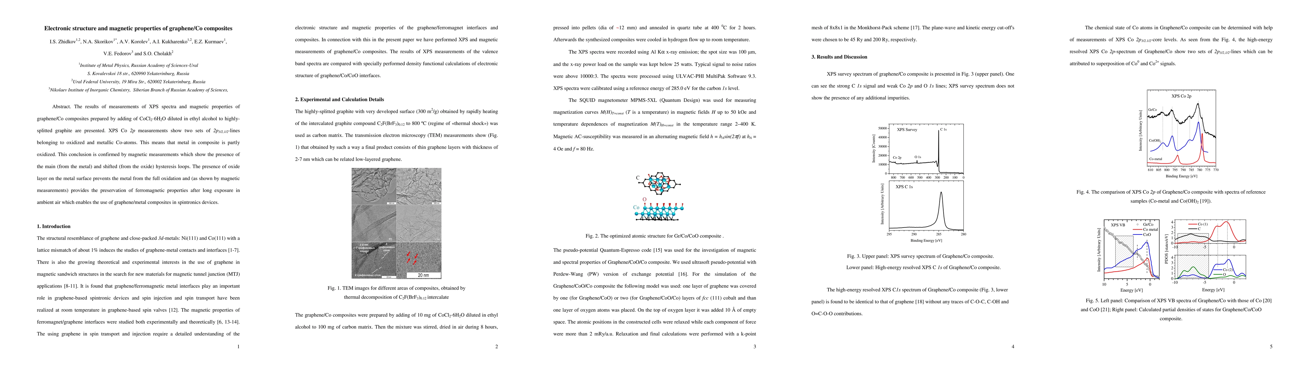 This study investigates the electronic structure and magnetic properties of graphene/Co composites, revealing that XPS spectra show both oxidized and metallic Co, confirmed by distinct hysteresis loops. The oxide layer on the metal surface preserves ferromagnetic properties, making these composites suitable for spintronics applications.
