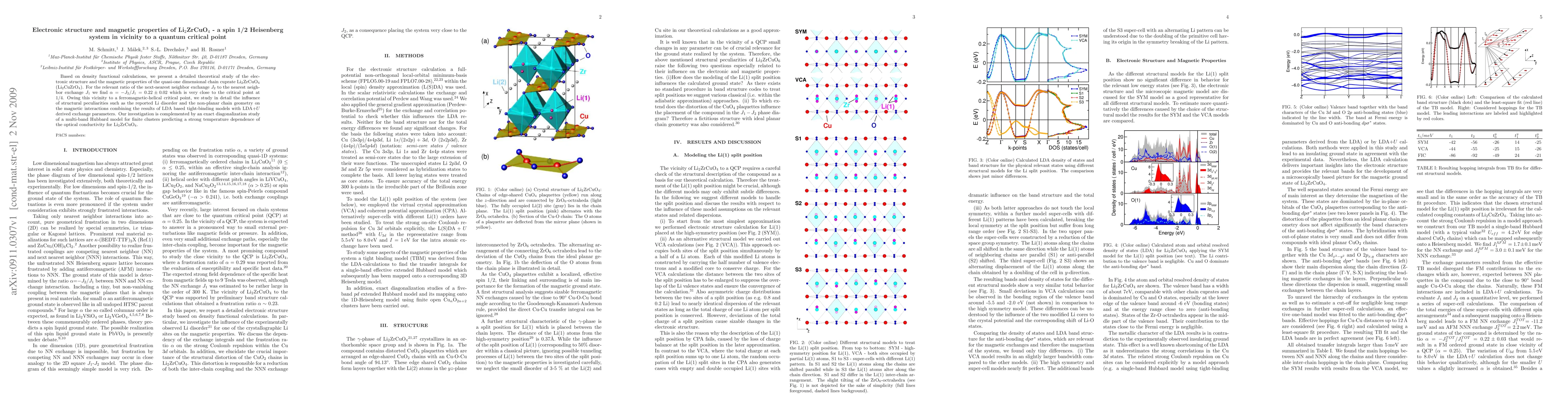 Based on density functional calculations, we present a detailed theoretical study of the electronic structure and the magnetic properties of the quasi-one dimensional chain cuprate Li_2ZrCuO_4 (Li_2CuZrO_4). For the relevant ratio of the next-nearest neighbor exchange J_2 to the nearest neighbor exchange J_1 we find alpha = -J_2/J_1 = 0.22\pm0.02 which is very close to the critical point at 1/4. Owing this vicinity to a ferromagnetic-helical critical point, we study in detail the influence of structural peculiarities such as the reported Li disorder and the non-planar chain geometry on the magnetic interactions combining the results of LDA based tight-binding models with LDA+U derived exchange parameters. Our investigation is complemented by an exact diagonalization study of a multi-band Hubbard model for finite clusters predicting a strong temperature dependence of the optical conductivity for Li_2ZrCuO_4.