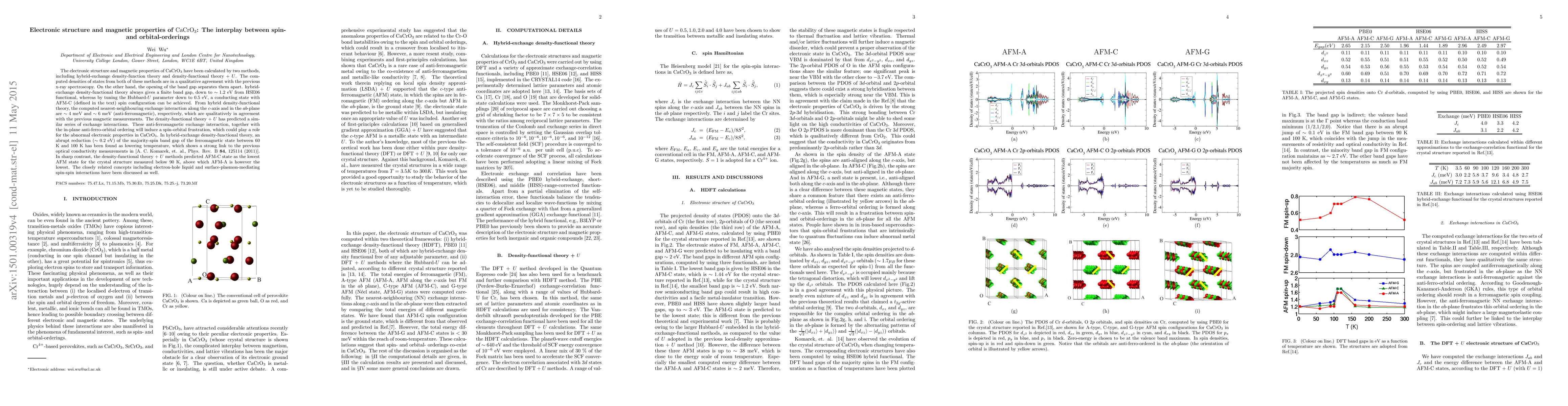 The electronic structure and magnetic properties of CaCr$\mathrm{O}_3$ have been calculated by two methods, including hybrid-exchange density-function theory and density-functional theory + $U$. The computed densities of states from both of these methods are in a qualitative agreement with the previous x-ray spectroscopy. On the other hand, the opening of the band gap separates them apart. hybrid-exchange density-functional theory always gives a finite band gap, down to $\sim 1.2$ eV from HSE06 functional, whereas by tuning the Hubbard-$U$ parameter down to $0.5$ eV, a conducting state with AFM-C (defined in the text) spin configuration can be achieved. From hybrid density-functional theory, the computed nearest-neighbouring exchange interaction along the $c$-axis and in the $ab$-plane are $\sim 4$ meV and $\sim 6$ meV (anti-ferromagnetic), respectively, which are qualitatively in agreement with the previous magnetic measurements. These anti-ferromagnetic exchange interaction, together with the in-plane anti-ferro-orbital ordering will induce a spin-orbital frustration, which could play a role for the abnormal electronic properties in CaCrO$_3$. In hybrid-exchange density-functional theory, an abrupt reduction ($\sim 0.2$ eV) of the majority-spin band gap of the ferromagnetic state between 60 K and 100 K has been found as lowering temperature, which shows a strong link to the previous optical conductivity measurements in [A. C. Komarek, et. al., Phys. Rev. B \textbf{84}, 125114 (2011)]. In sharp contrast, the density-functional theory + $U$ methods predicted AFM-C state as the lowest AFM state for the crystal structure measured below 90 K, above which AFM-A is however the lowest. The closely related concepts including electron-hole liquid and surface-plasmon-mediating spin-spin interactions have been discussed as well.