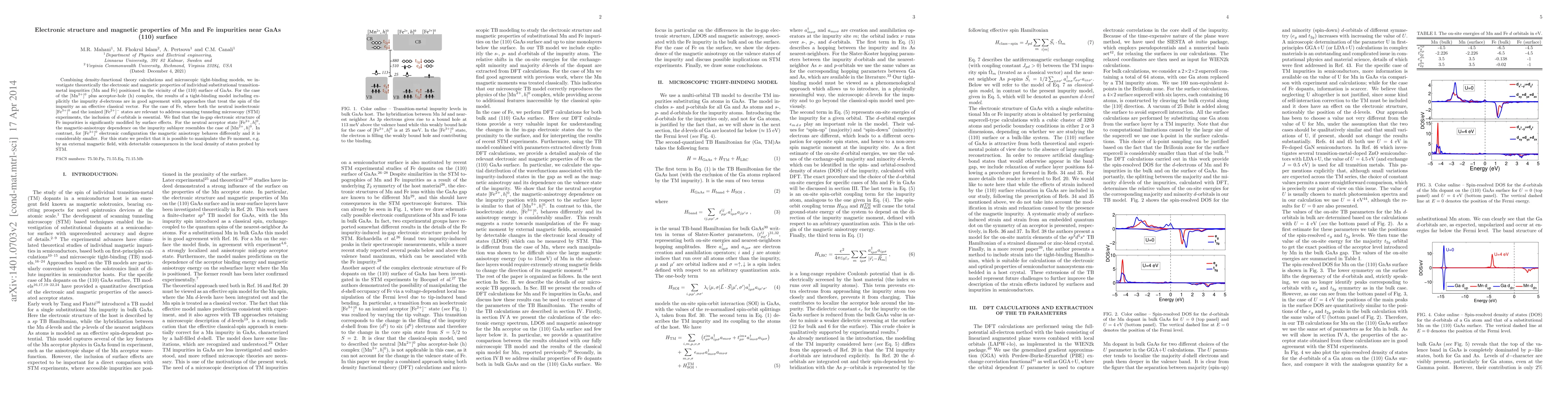 Combining density-functional theory calculations and microscopic tight-binding models, we investigate theoretically the electronic and magnetic properties of individual substitutional transition-metal impurities (Mn and Fe) positioned in the vicinity of the (110) surface of GaAs. For the case of the $[\rm Mn^{2+}]^0$ plus acceptor-hole (h) complex, the results of a tight-binding model including explicitly the impurity $d$-electrons are in good agreement with approaches that treat the spin of the impurity as an effective classical vector. For the case of Fe, where both the neutral isoelectronic $[\rm Fe^{3+}]^0$ and the ionized $[\rm Fe^{2+}]^-$ states are relevant to address scanning tunneling microscopy (STM) experiments, the inclusion of $d$-orbitals is essential. We find that the in-gap electronic structure of Fe impurities is significantly modified by surface effects. For the neutral acceptor state $[{\rm Fe}^{2+}, h]^0$, the magnetic-anisotropy dependence on the impurity sublayer resembles the case of $[{\rm Mn}^{2+}, h]^0$. In contrast, for $[{\rm Fe}^{3+}]^{0}$ electronic configuration the magnetic anisotropy behaves differently and it is considerably smaller. For this state we predict that it is possible to manipulate the Fe moment, e.g. by an external magnetic field, with detectable consequences in the local density of states probed by STM.