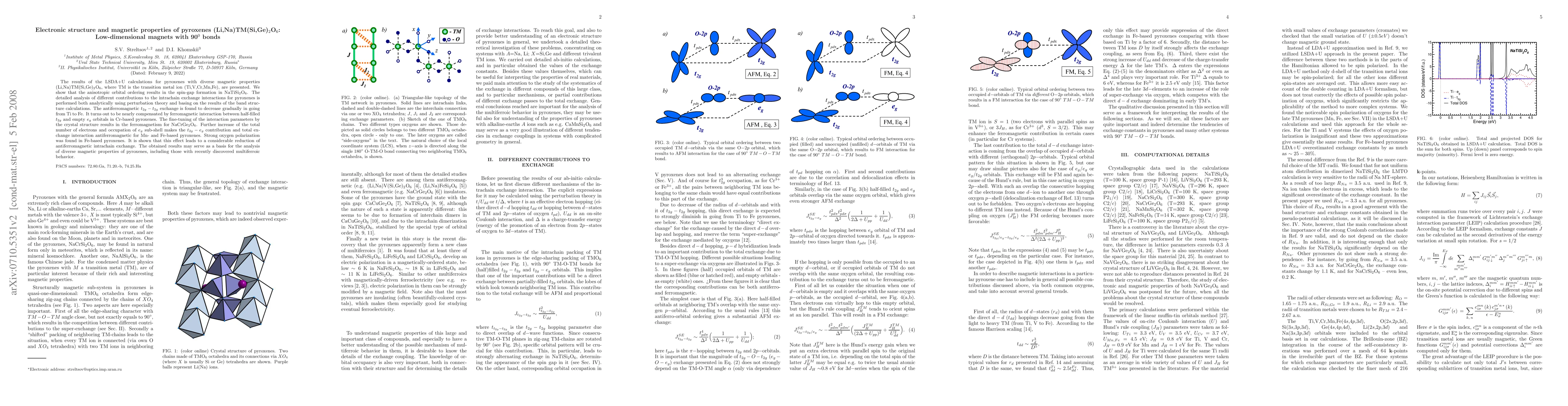 The results of the LSDA+U calculations for pyroxenes with diverse magnetic properties (Li,Na)TM(Si,Ge)$_2$O$_6$, where TM is the transition metal ion (Ti,V,Cr,Mn,Fe), are presented. We show that the anisotropic orbital ordering results in the spin-gap formation in NaTiSi$_2$O$_6$. The detailed analysis of different contributions to the intrachain exchange interactions for pyroxenes is performed both analytically using perturbation theory and basing on the results of the band structure calculations. The antiferromagnetic $t_{2g}-t_{2g}$ exchange is found to decrease gradually in going from Ti to Fe. It turns out to be nearly compensated by ferromagnetic interaction between half-filled $t_{2g}$ and empty $e_g$ orbitals in Cr-based pyroxenes. The fine-tuning of the interaction parameters by the crystal structure results in the ferromagnetism for NaCrGe$_2$O$_6$. Further increase of the total number of electrons and occupation of $e_g$ sub-shell makes the $t_{2g}-e_g$ contribution and total exchange interaction antiferromagnetic for Mn- and Fe-based pyroxenes. Strong oxygen polarization was found in Fe-based pyroxenes. It is shown that this effect leads to a considerable reduction of antiferromagnetic intrachain exchange. The obtained results may serve as a basis for the analysis of diverse magnetic properties of pyroxenes, including those with recently discovered multiferroic behavior.