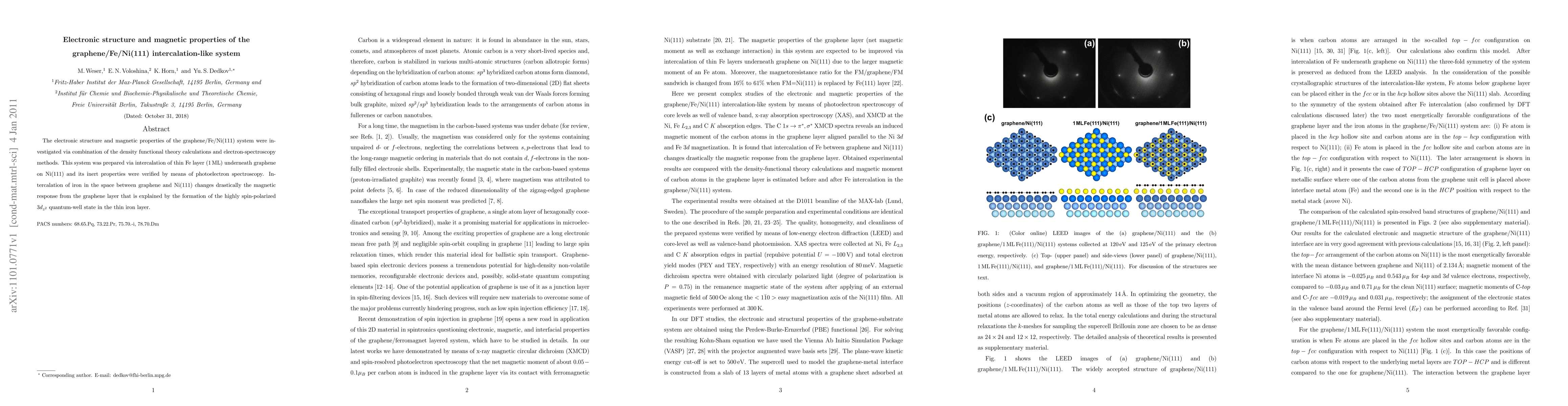 The paper presents a detailed analysis of the electronic structure and magnetic properties of the graphene/Fe/Ni(111) system, highlighting the role of intercalated iron in altering graphene's magnetic response.