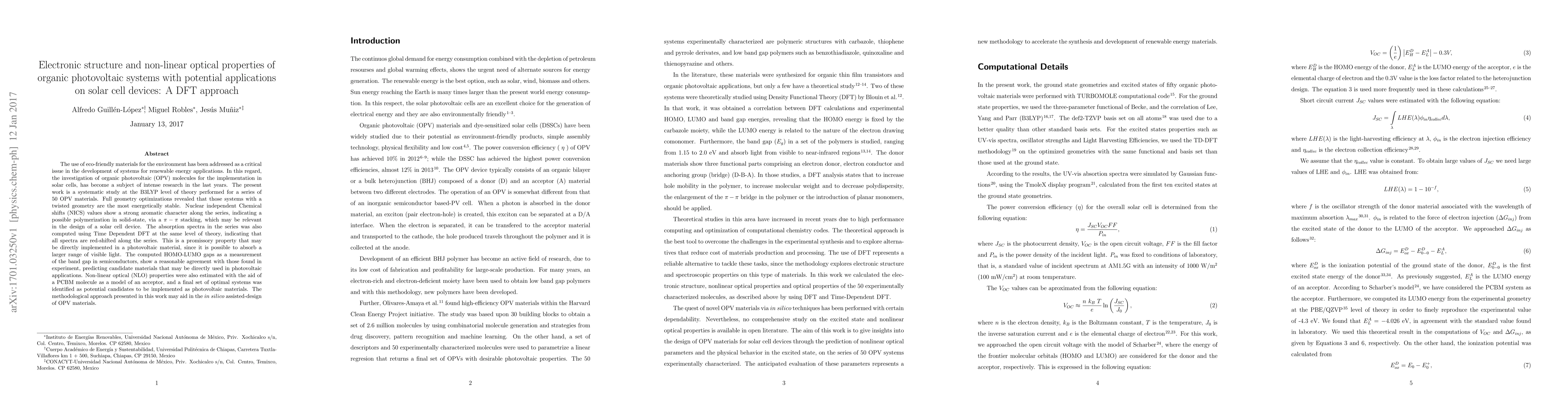 The use of eco-friendly materials for the environment has been addressed as a critical issue in the development of systems for renewable energy applications. In this regard, the investigation of organic photovoltaic (OPV) molecules for the implementation in solar cells, has become a subject of intense research in the last years. The present work is a systematic study at the B3LYP level of theory performed for a series of 50 OPV materials. Full geometry optimizations revealed that those systems with a twisted geometry are the most energetically stable. Nuclear independent Chemical shifts (NICS) values show a strong aromatic character along the series, indicating a possible polymerization in solid-state, via a {\pi}-{\pi} stacking, which may be relevant in the design of a solar cell device. The absorption spectra in the series was also computed using Time Dependent DFT at the same level of theory, indicating that all spectra are red-shifted along the series. This is a promissory property that may be directly implemented in a photovoltaic material, since it is possible to absorb a larger range of visible light. The computed HOMO-LUMO gaps as a measurement of the band gap in semiconductors, show a reasonable agreement with those found in experiment, predicting candidate materials that may be directly used in photovoltaic applications. Non-linear optical (NLO) properties were also estimated with the aid of a PCBM molecule as a model of an acceptor, and a final set of optimal systems was identified as potential candidates to be implemented as photovoltaic materials. The methodological approach presented in this work may aid in the in silico assisted-design of OPV materials.
