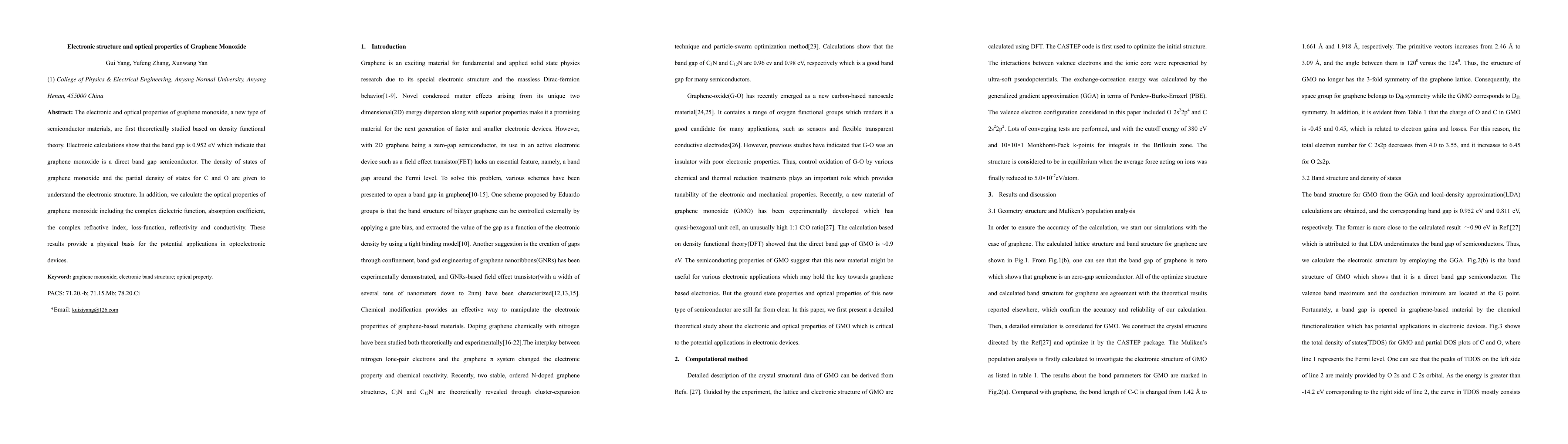 This research theoretically investigates the electronic and optical properties of graphene monoxide using density functional theory, revealing a 0.952 eV direct band gap and providing detailed insights into its electronic structure and optical characteristics, which suggest its potential for optoelectronic applications.