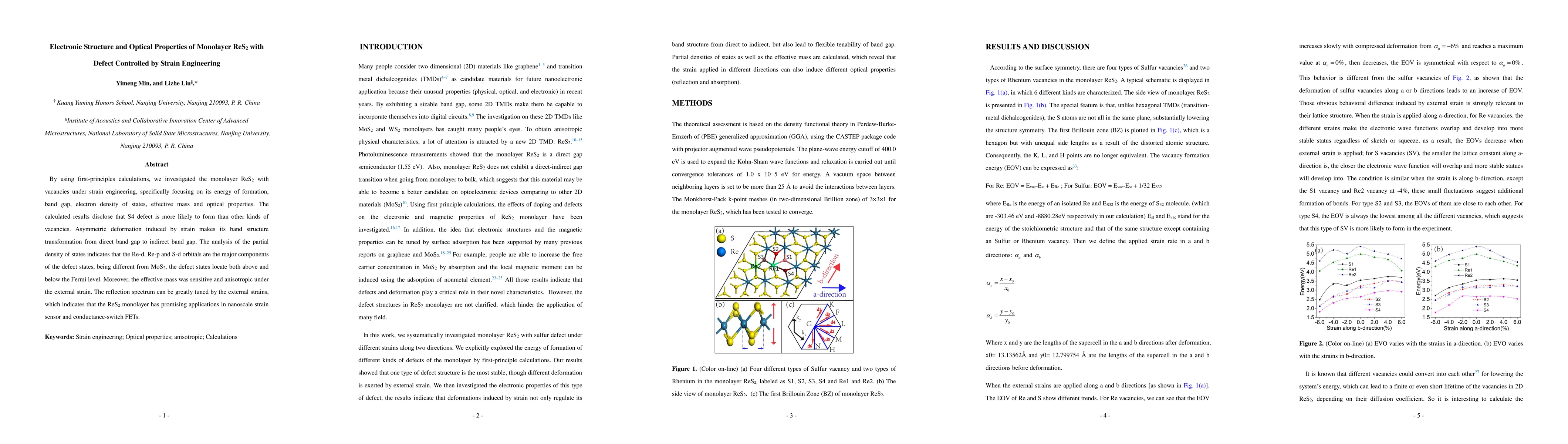 This study uses first-principles calculations to explore how strain engineering affects the electronic structure and optical properties of monolayer $ReS_2$ with vacancies. The S4 defect is found to be the most likely to form under strain, transforming the band gap from direct to indirect and significantly altering the effective mass and optical reflection spectrum, suggesting potential applications in strain sensors and FETs.