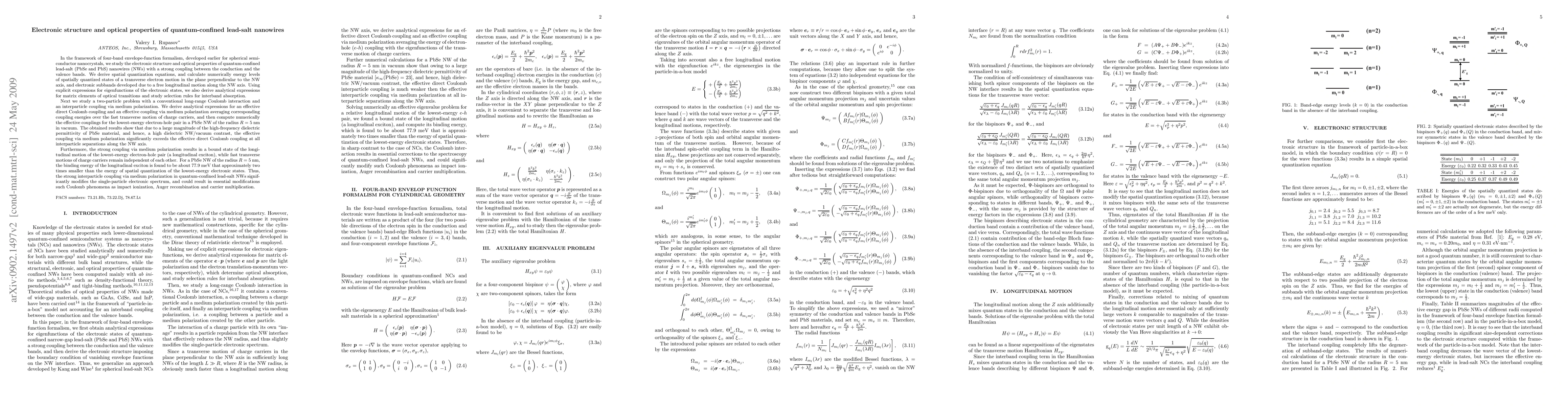 This paper investigates the electronic structure and optical properties of quantum-confined lead-salt nanowires (PbSe and PbS) using four-band envelope-function formalism. It finds significant effective coupling via medium polarization, leading to a longitudinal exciton state and independent transverse motions.