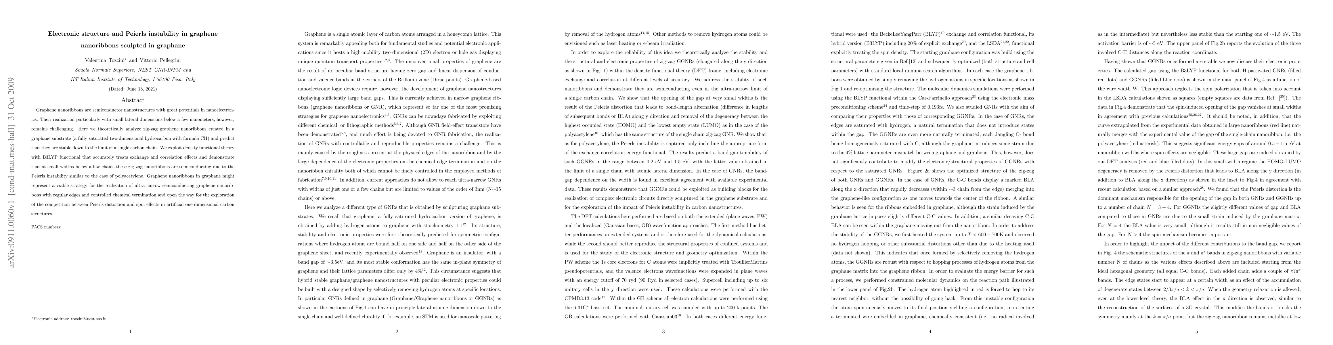 Graphene nanoribbons are semiconductor nanostructures with great potentials in nanoelectronics. Their realization particularly with small lateral dimensions below a few nanometers, however, remains challenging. Here we theoretically analyze zig-zag graphene nanoribbons created in a graphane substrate (a fully saturated two-dimensional hydrocarbon with formula CH) and predict that they are stable down to the limit of a single carbon chain. We exploit density functional theory with B3LYP functional that accurately treats exchange and correlation effects and demonstrate that at small widths below a few chains these zig-zag nanoribbons are semiconducting due to the Peierls instability similar to the case of polyacetylene. Graphene nanoribbons in graphane might represent a viable strategy for the realization of ultra-narrow semiconducting graphene nanoribbons with regular edges and controlled chemical termination and open the way for the exploration of the competition between Peierls distortion and spin effects in artificial one-dimensional carbon structures.