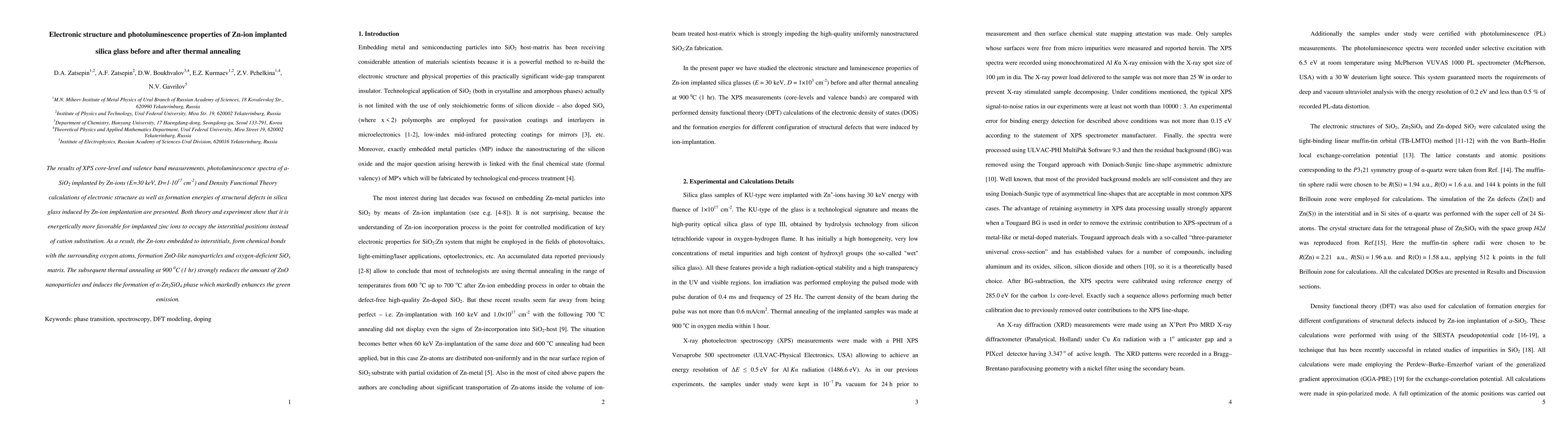 This study investigates the electronic structure and photoluminescence of Zn-ion implanted silica glass, revealing that Zn-ions prefer interstitial positions over substitution, forming ZnO-like nanoparticles. Thermal annealing at 900°C induces the formation of α-Zn2SiO4, enhancing green photoluminescence.