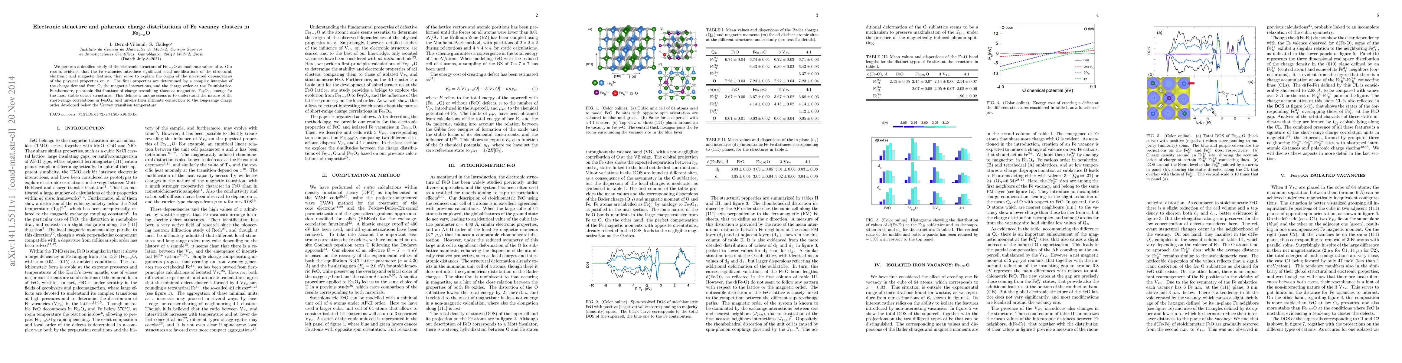 We perform a detailed study of the electronic structure of Fe$_{1-x}$O at moderate values of $x$. Our results evidence that the Fe vacancies introduce significant local modifications of the structural, electronic and magnetic features, that serve to explain the origin of the measured dependencies of the physical properties on $x$. The final properties are determined by a complex interplay of the charge demand from O, the magnetic interactions, and the charge order at the Fe sublattice. Furthermore, polaronic distributions of charge resembling those at magnetite, Fe$_3$O$_4$, emerge for the most stable defect structures. This defines a unique scenario to understand the nature of the short-range correlations in Fe$_3$O$_4$, and unveils their intimate connection to the long-range charge order developed below the Verwey transition temperature.