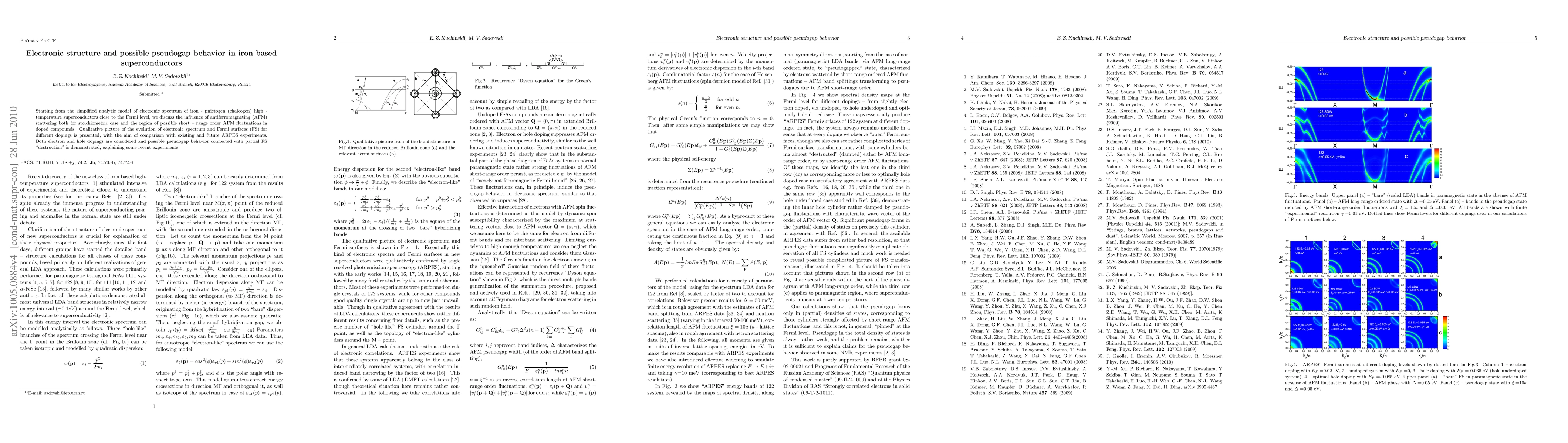 This paper explores the electronic structure of iron-based superconductors using an analytic model, focusing on the effects of antiferromagnetic scattering. It presents a qualitative picture of how electronic spectra and Fermi surfaces evolve with doping and discusses the pseudogap behavior linked to partial Fermi surface destruction, aiming to explain recent experimental findings.