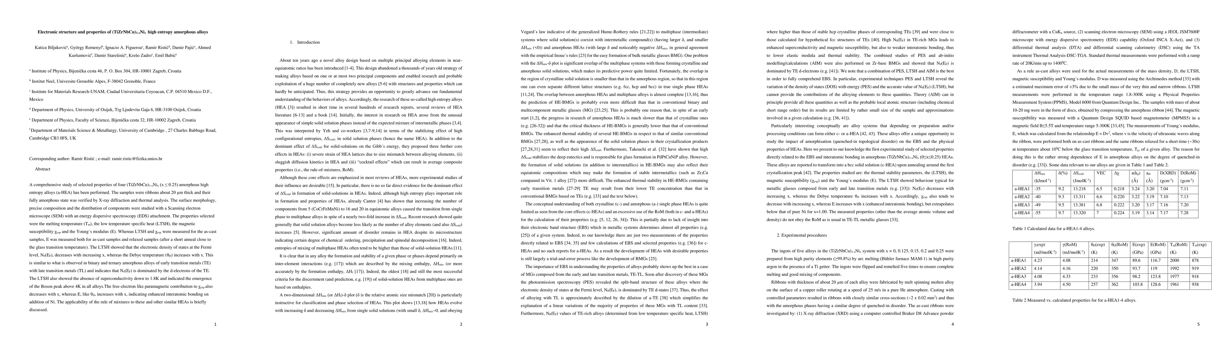 This study investigates the electronic structure and properties of (TiZrNbCu)_1-xNi_x amorphous high entropy alloys, revealing that the low-temperature specific heat decreases with increasing Ni content, while the Debye temperature increases, suggesting enhanced interatomic bonding. The Young's modulus also rises with Ni addition, indicating stronger bonding.