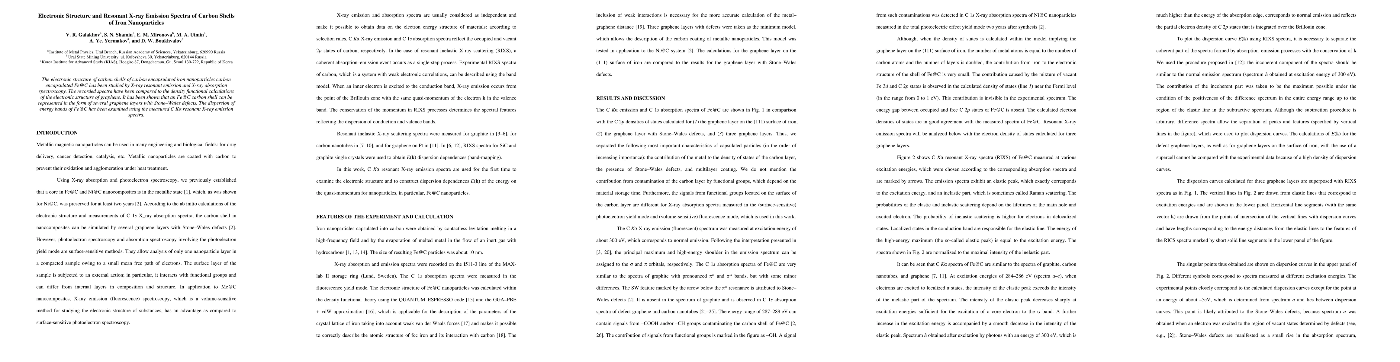 The electronic structure of carbon shells of carbon encapsulated iron nanoparticles carbon encapsulated Fe@C has been studied by X-ray resonant emission and X-ray absorption spectroscopy. The recorded spectra have been compared to the density functional calculations of the electronic structure of graphene. It has been shown that an Fe@C carbon shell can be represented in the form of several graphene layers with Stone-Wales defects. The dispersion of energy bands of Fe@C has been examined using the measured C Ka resonant X-ray emission spectra.