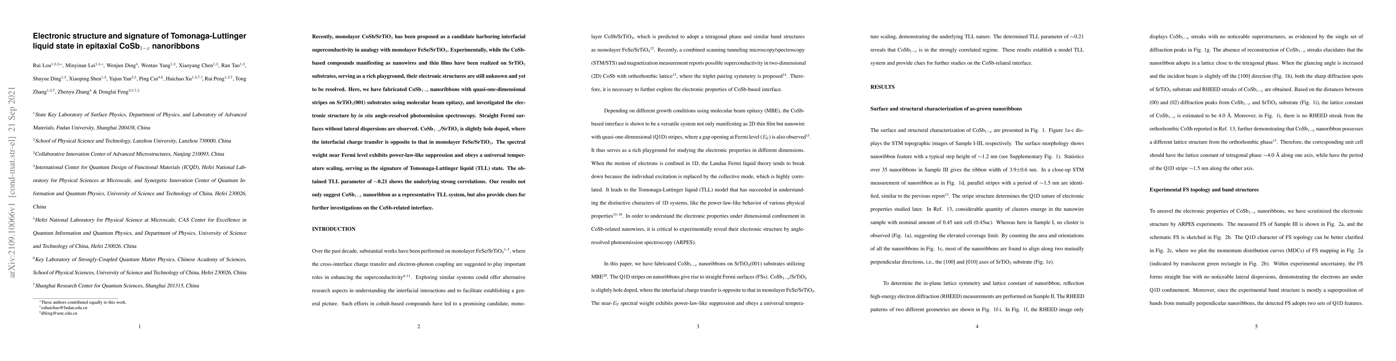 Recently, monolayer CoSb/SrTiO$_3$ has been proposed as a candidate harboring interfacial superconductivity in analogy with monolayer FeSe/SrTiO$_3$. Experimentally, while the CoSb-based compounds manifesting as nanowires and thin films have been realized on SrTiO$_3$ substrates, serving as a rich playground, their electronic structures are still unknown and yet to be resolved. Here, we have fabricated CoSb$_{1-x}$ nanoribbons with quasi-one-dimensional stripes on SrTiO$_3$(001) substrates using molecular beam epitaxy, and investigated the electronic structure by in situ angle-resolved photoemission spectroscopy. Straight Fermi surfaces without lateral dispersions are observed. CoSb$_{1-x}$/SrTiO$_3$ is slightly hole doped, where the interfacial charge transfer is opposite to that in monolayer FeSe/SrTiO$_3$. The spectral weight near Fermi level exhibits power-law-like suppression and obeys a universal temperature scaling, serving as the signature of Tomonaga-Luttinger liquid (TLL) state. The obtained TLL parameter of $\sim$0.21 shows the underlying strong correlations. Our results not only suggest CoSb$_{1-x}$ nanoribbon as a representative TLL system, but also provide clues for further investigations on the CoSb-related interface.