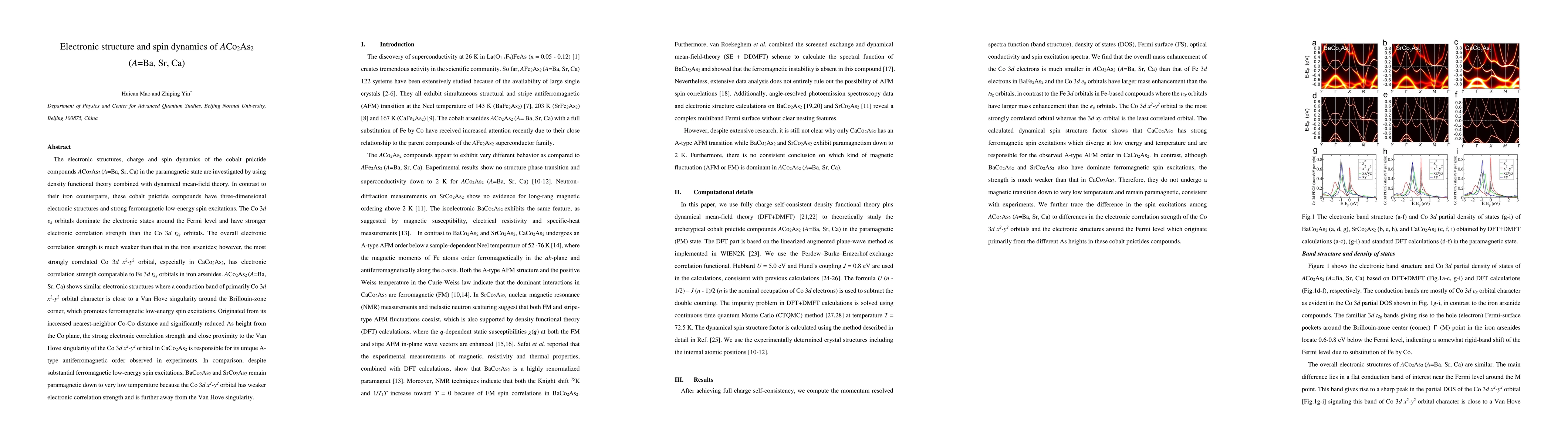 This paper investigates the electronic structures and spin dynamics of ACo2As2 (A=Ba, Sr, Ca) cobalt pnictides, revealing their three-dimensional electronic structures and strong ferromagnetic spin excitations. It finds that while all compounds share similar structures, CaCo2As2 exhibits strong electronic correlation and unique antiferromagnetic order due to its Co 3d x2-y2 orbital characteristics.