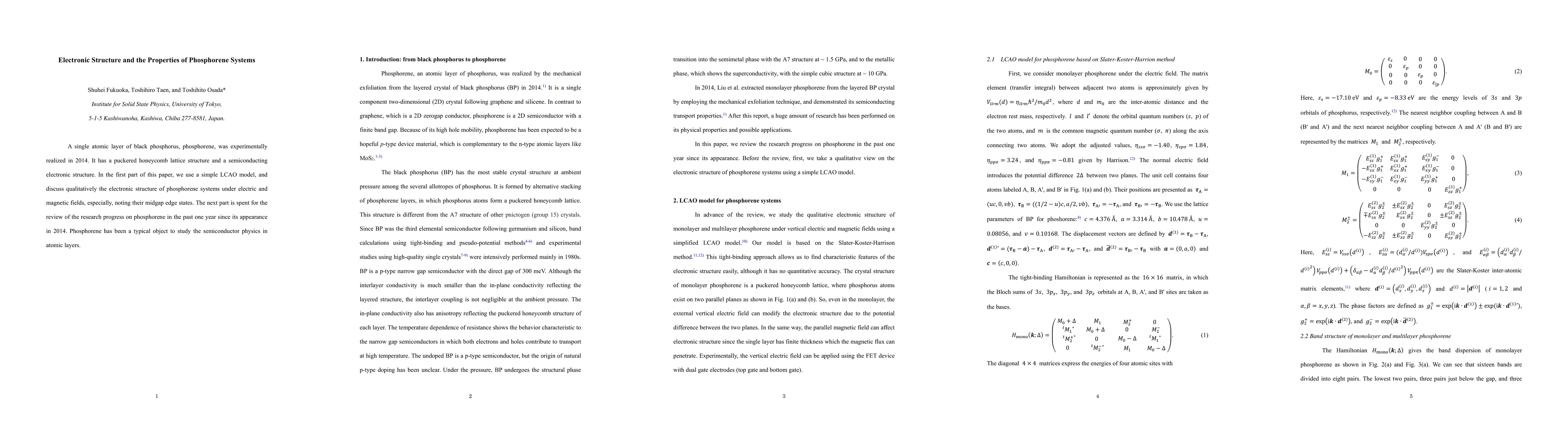 This paper explores the electronic structure of phosphorene under electric and magnetic fields, highlighting its midgap edge states, and reviews the advancements in phosphorene research since its experimental realization in 2014, emphasizing its significance in atomic layer semiconductor physics.