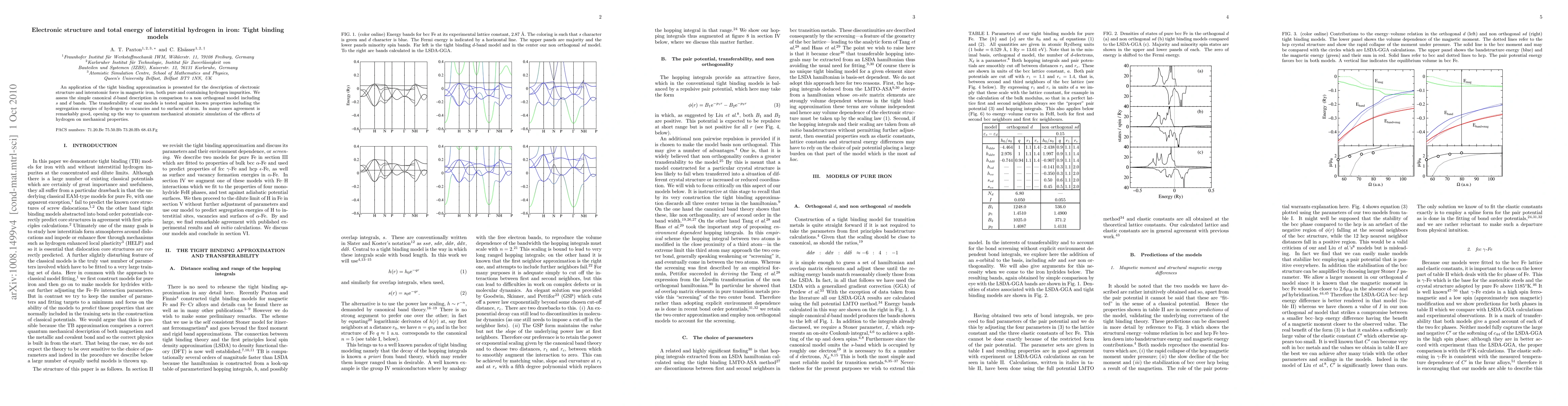 This paper applies tight binding models to describe the electronic structure and interatomic forces in iron, both pure and with hydrogen impurities. The study compares canonical d-band models to non-orthogonal models including s and d bands, showing good agreement with known segregation energies, which facilitates quantum mechanical simulations of hydrogen's impact on iron's mechanical properties.