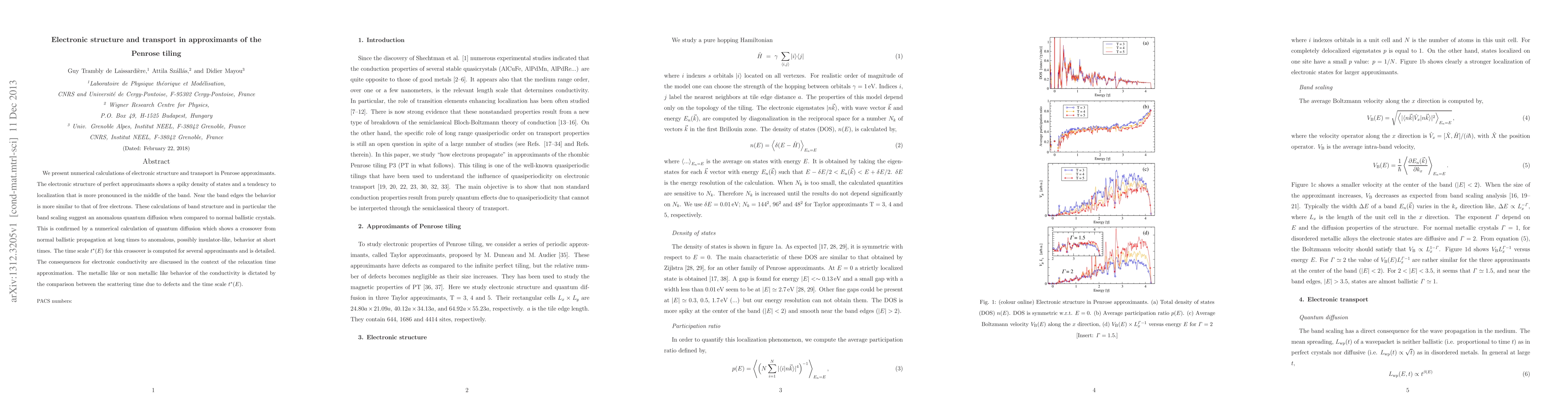 We present numerical calculations of electronic structure and transport in Penrose approximants. The electronic structure of perfect approximants shows a spiky density of states and a tendency to localization that is more pronounced in the middle of the band. Near the band edges the behavior is more similar to that of free electrons. These calculations of band structure and in particular the band scaling suggest an anomalous quantum diffusion when compared to normal ballistic crystals. This is confirmed by a numerical calculation of quantum diffusion which shows a crossover from normal ballistic propagation at long times to anomalous, possibly insulator-like, behavior at short times. The time scale t*(E) for this crossover is computed for several approximants and is detailed. The consequences for electronic conductivity are discussed in the context of the relaxation time approximation. The metallic like or non metallic like behavior of the conductivity is dictated by the comparison between the scattering time due to defects and the time scale t*(E).