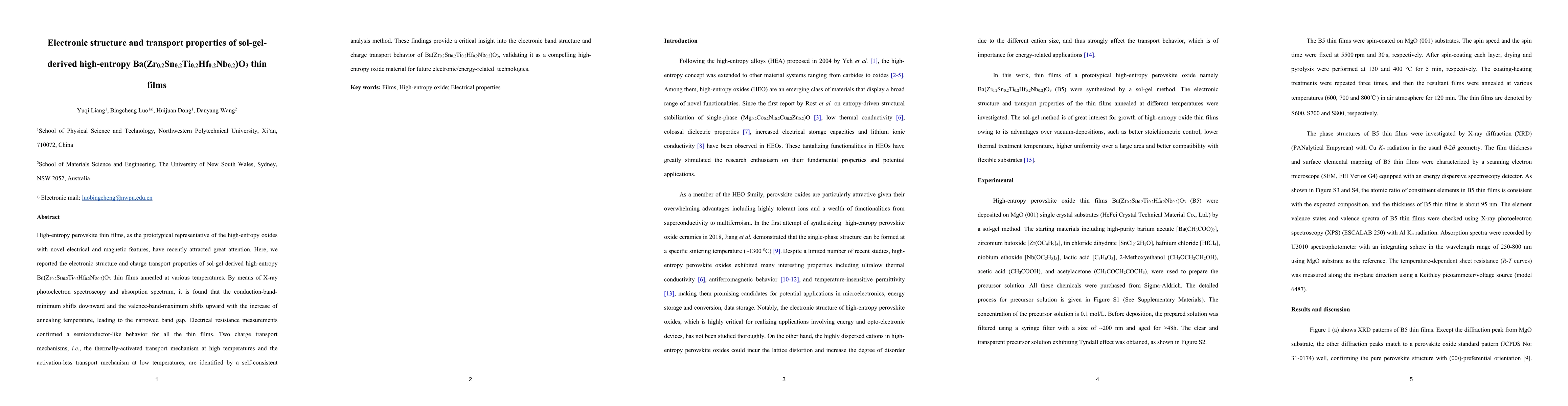 This study investigates the electronic structure and transport properties of sol-gel-derived high-entropy Ba(Zr0.2Sn0.2Ti0.2Hf0.2Nb0.2)O3 thin films, revealing a downward shift in the conduction band and an upward shift in the valence band with increased annealing temperature, resulting in a narrowed band gap. Electrical resistance measurements confirm semiconductor-like behavior, with two identified charge transport mechanisms.