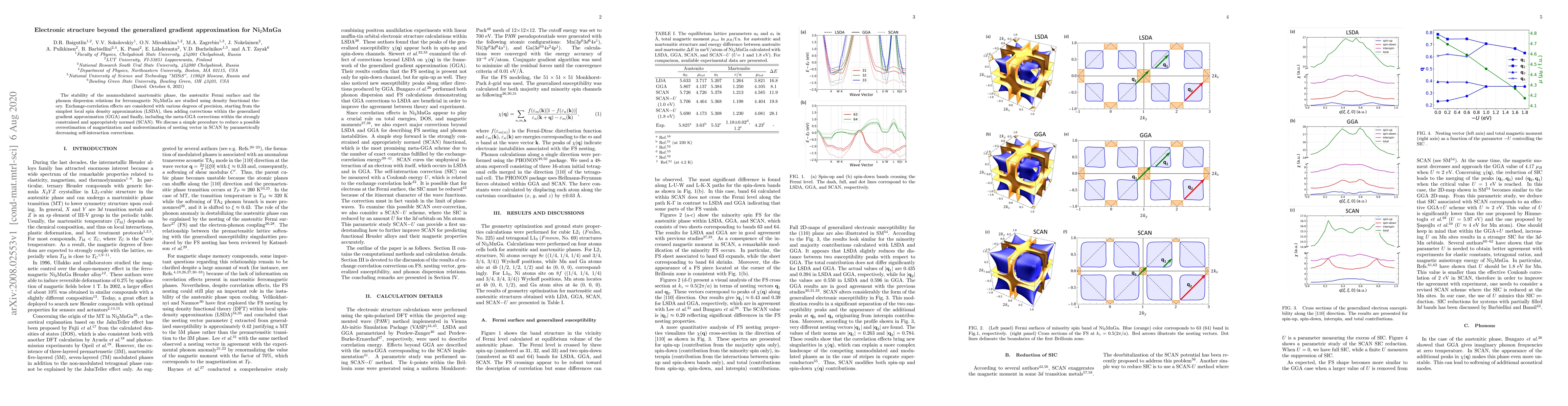 The stability of the nonmodulated martensitic phase, the austenitic Fermi surface and the phonon dispersion relations for ferromagnetic Ni$_2$MnGa are studied using density functional theory. Exchange-correlation effects are considered with various degrees of precision, starting from the simplest local spin density approximation (LSDA), then adding corrections within the generalized gradient approximation (GGA) and finally, including the meta-GGA corrections within the strongly constrained and appropriately normed (SCAN). We discuss a simple procedure to reduce a possible overestimation of magnetization and underestimation of nesting vector in SCAN by parametrically decreasing self-interaction corrections.