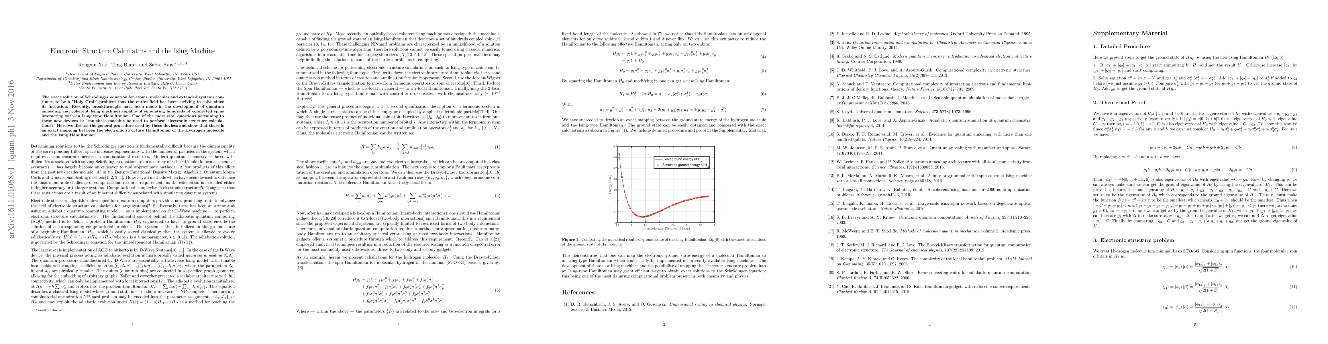 The exact solution of Schrodinger equation for atoms, molecules and extended systems continues to be a "Holy Grail" problem that the entire field has been striving to solve since its inception. Recently, breakthroughs have been made in the development of quantum annealing and coherent Ising machines capable of simulating hundreds of connected spins interacting with an Ising type Hamiltonian. One of the most vital questions pertaining to these new devices is: 'can these machine be used to perform electronic structure calculations?' Here we discuss the general procedure used by these devices and show that there is an exact mapping between the electronic structure Hamiltonian of the Hydrogen molecule and the Ising Hamiltonian