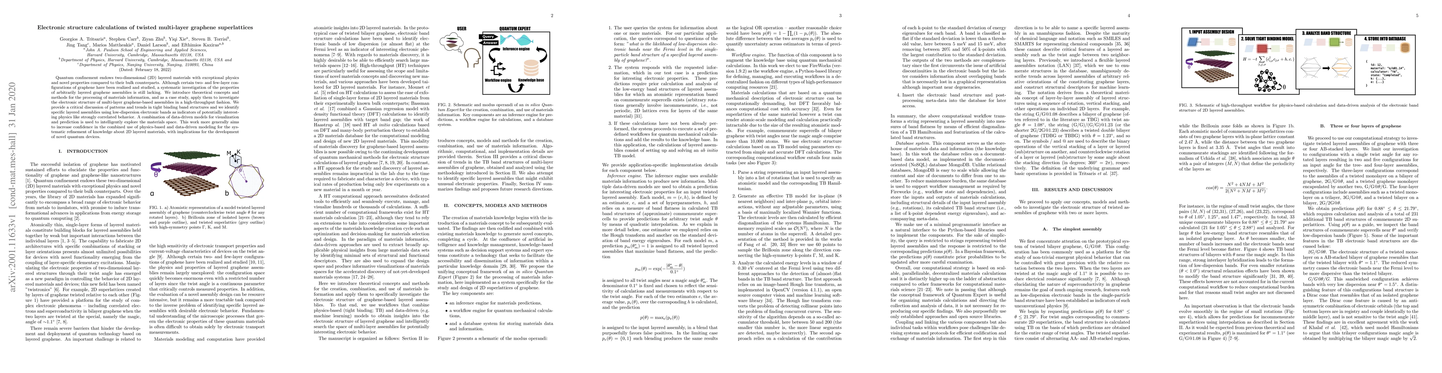 Quantum confinement endows two-dimensional (2D) layered materials with exceptional physics and novel properties compared to their bulk counterparts. Although certain two- and few-layer configurations of graphene have been realized and studied, a systematic investigation of the properties of arbitrarily layered graphene assemblies is still lacking. We introduce theoretical concepts and methods for the processing of materials information, and as a case study, apply them to investigate the electronic structure of multi-layer graphene-based assemblies in a high-throughput fashion. We provide a critical discussion of patterns and trends in tight binding band structures and we identify specific layered assemblies using low-dispersion electronic bands as indicators of potentially interesting physics like strongly correlated behavior. A combination of data-driven models for visualization and prediction is used to intelligently explore the materials space. This work more generally aims to increase confidence in the combined use of physics-based and data-driven modeling for the systematic refinement of knowledge about 2D layered materials, with implications for the development of novel quantum devices.