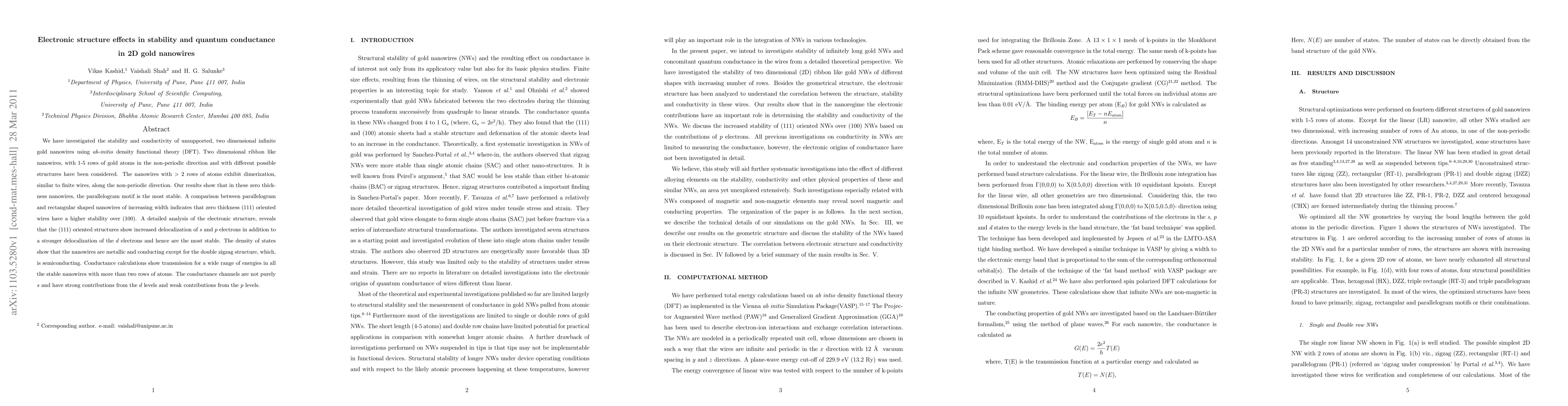 We have investigated the stability and conductivity of unsupported, two dimensional infinite gold nanowires using ab-initio density functional theory (DFT). Two dimensional ribbon like nanowires, with 1-5 rows of gold atoms in the non-periodic direction and with different possible structures have been considered. The nanowires with > 2 rows of atoms exhibit dimerization, similar to finite wires, along the non-periodic direction. Our results show that in these zero thickness nanowires, the parallelogram motif is the most stable. A comparison between parallelogram and rectangular shaped nanowires of increasing width indicates that zero thickness (111) oriented wires have a higher stability over (100). A detailed analysis of the electronic structure, reveals that the (111) oriented structures show increased delocalization of s and p electrons in addition to a stronger delocalization of the d electrons and hence are the most stable. The density of states show that the nanowires are metallic and conducting except for the double zigzag structure, which, is semiconducting. Conductance calculations show transmission for a wide range of energies in all the stable nanowires with more than two rows of atoms. The conductance channels are not purely s and have strong contributions from the d levels and weak contributions from the p levels.