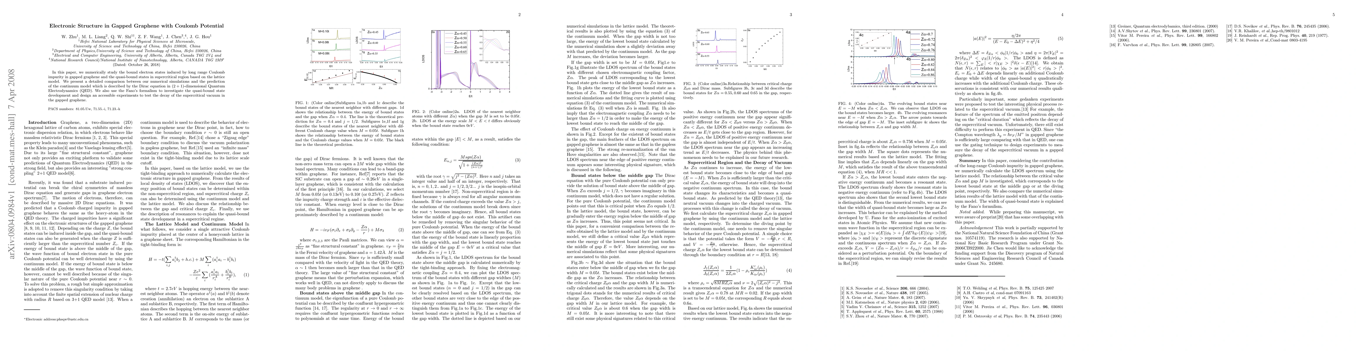 This paper numerically investigates the bound electron states in gapped graphene due to long-range Coulomb impurities, comparing lattice model simulations to continuum predictions from the Dirac equation in QED. It also explores quasi-bound states using Fano's formalism and proposes experiments to test supercritical vacuum decay in graphene.