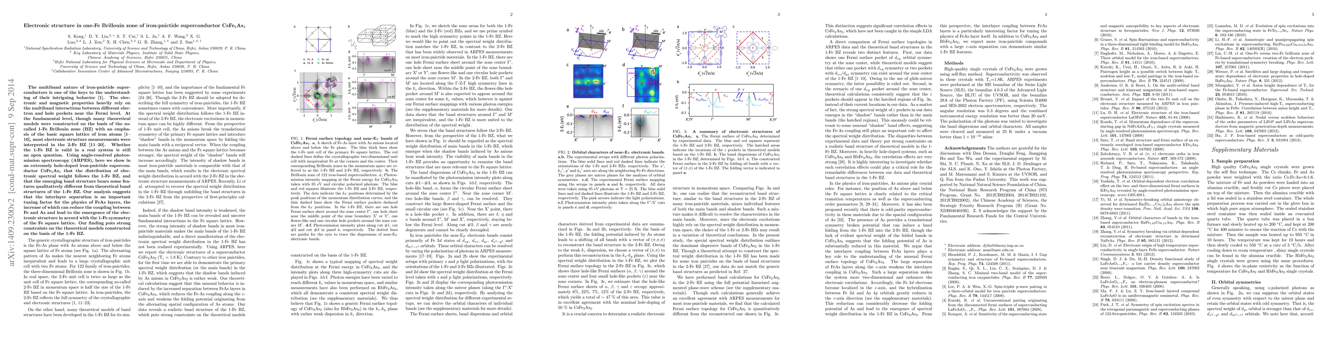 This study uses ARPES to demonstrate that the electronic structure of the hole-doped iron-pnictide superconductor CsFe$_2$As$_2$ follows the 1-Fe Brillouin zone, challenging existing theoretical models based on the 2-Fe BZ. The interlayer separation is identified as a crucial factor influencing the FeAs layers' coupling and electronic behavior.