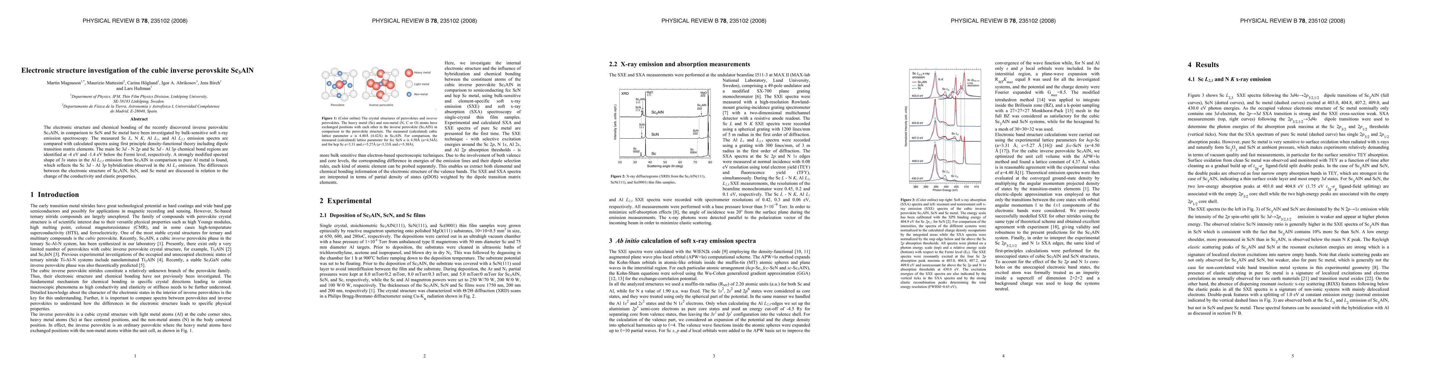 This research uses soft x-ray emission spectroscopy to investigate the electronic structure of the inverse perovskite Sc3AlN, contrasting it with ScN and Sc metal. Key findings include identifying main Sc 3d-N 2p and Sc 3d-Al 3p bond regions, and observing modified Al L2,3 spectral shape due to Sc 3d-Al 3p hybridization. The study discusses these differences in relation to conductivity and elastic properties changes.