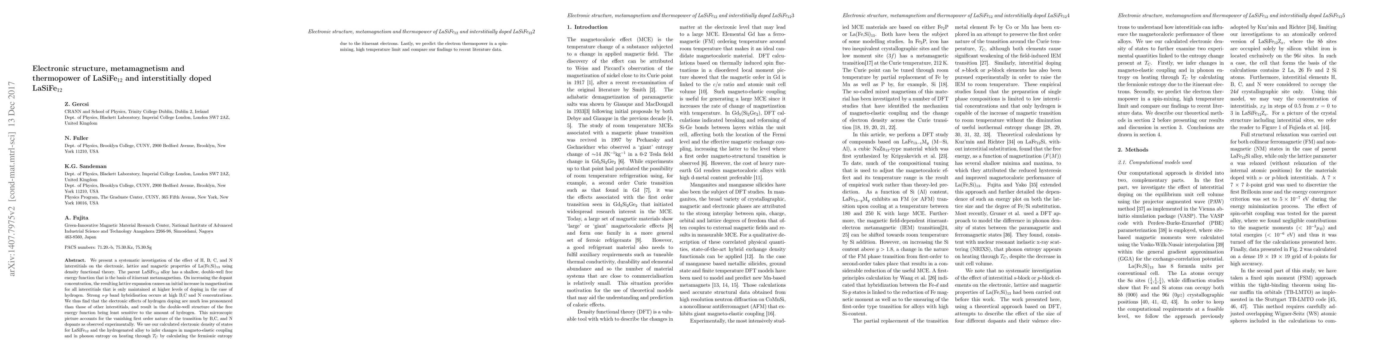 We present a systematic investigation of the effect of H, B, C, and N interstitials on the electronic, lattice and magnetic properties of La(Fe,Si)$_{13}$ using density functional theory. The parent LaSiFe$_{12}$ alloy has a shallow, double-well free energy function that is the basis of itinerant metamagnetism. On increasing the dopant concentration, the resulting lattice expansion causes an initial increase in magnetisation for all interstitials that is only maintained at higher levels of doping in the case of hydrogen. Strong s-p band hybridisation occurs at high B,C and N concentrations. We thus find that the electronic effects of hydrogen doping are much less pronounced than those of other interstitials, and result in the double-well structure of the free energy function being least sensitive to the amount of hydrogen. This microscopic picture accounts for the vanishing first order nature of the transition by B,C, and N dopants as observed experimentally. We use our calculated electronic density of states for LaSiFe$_{12}$ and the hydrogenated alloy to infer changes in magneto-elastic coupling and in phonon entropy on heating through $T_C$ by calculating the fermionic entropy due to the itinerant electrons. Lastly, we predict the electron thermopower in a spin-mixing, high temperature limit and compare our findings to recent literature data.