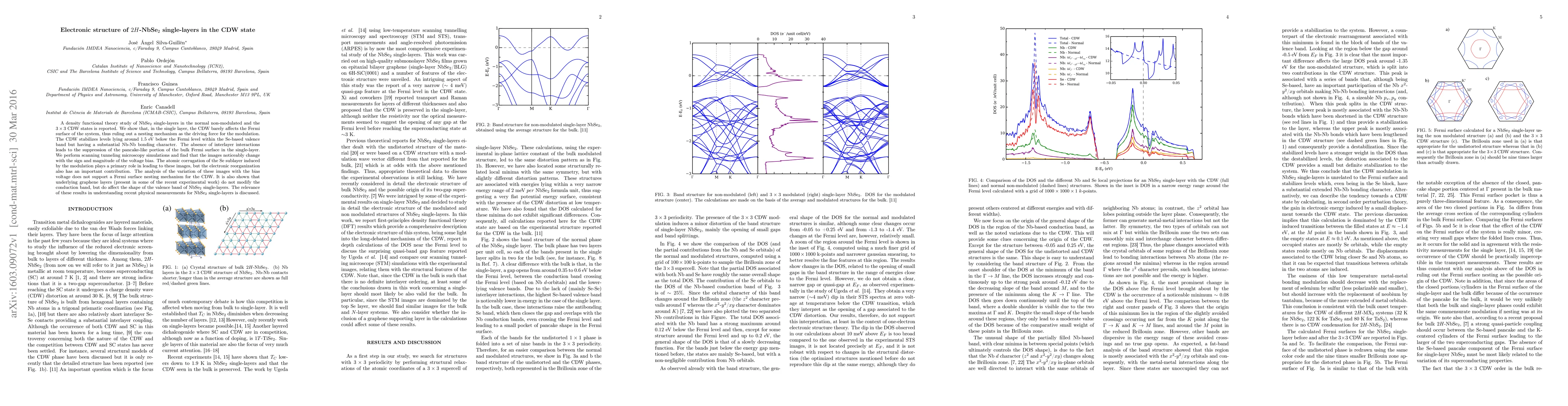 A density functional theory study of NbSe$_2$ single-layers in the normal non-modulated and the $3\times3$ CDW states is reported. We show that, in the single layer, the CDW barely affects the Fermi surface of the system, thus ruling out a nesting mechanism as the driving force for the modulation. The CDW stabilizes levels lying around 1.5 eV below the Fermi level within the Se-based valence band but having a substantial Nb-Nb bonding character. The absence of interlayer interactions leads to the suppression of the pancake-like portion of the bulk Fermi surface in the single-layer. We perform scanning tunneling microscopy simulations and find that the images noticeably change with the sign and magnitude of the voltage bias. The atomic corrugation of the Se sublayer induced by the modulation plays a primary role in leading to these images, but the electronic reorganization also has an important contribution. The analysis of the variation of these images with the bias voltage does not support a Fermi surface nesting mechanism for the CDW. It is also shown that underlying graphene layers (present in some of the recent experimental work) do not modify the conduction band, but do affect the shape of the valence band of NbSe$_2$ single-layers. The relevance of these results in understanding recent physical measurements for NbSe$_2$ single-layers is discussed.