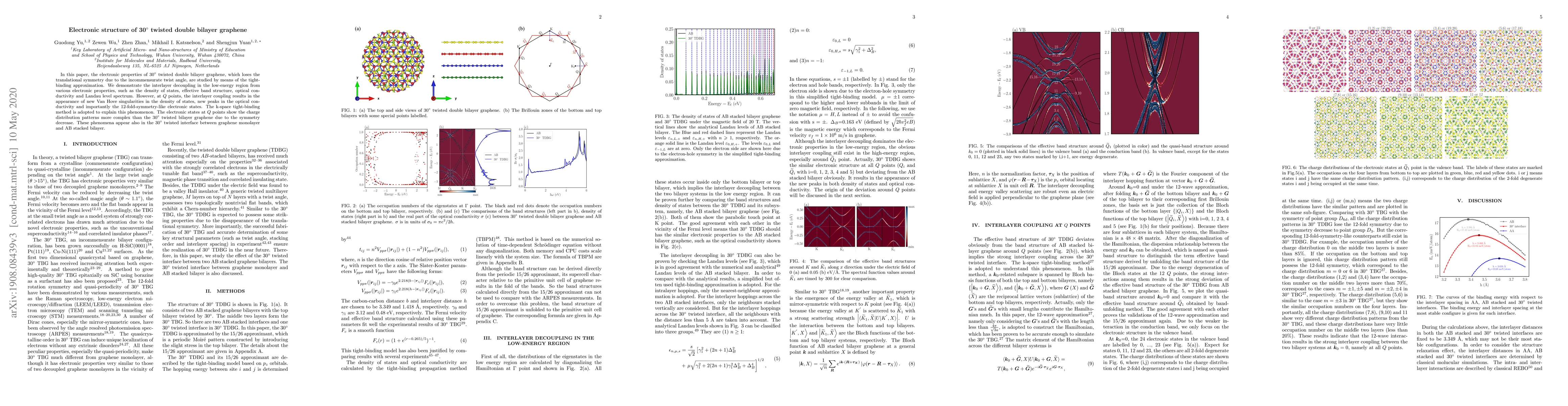 This paper investigates the electronic properties of 30° twisted double bilayer graphene, revealing interlayer decoupling and new phenomena at Q points due to reduced symmetry, including complex charge distribution patterns and new Van Hove singularities.