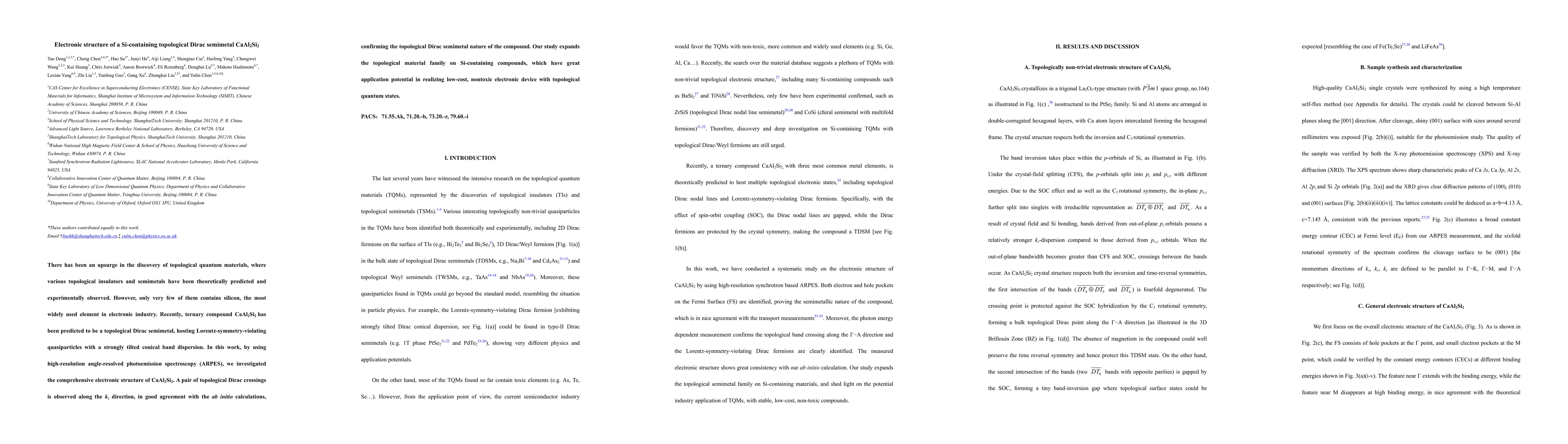 Researchers used ARPES to confirm that CaAl2Si2 is a topological Dirac semimetal with a unique electronic structure, expanding the family of Si-containing compounds with potential applications in low-cost, non-toxic electronics.