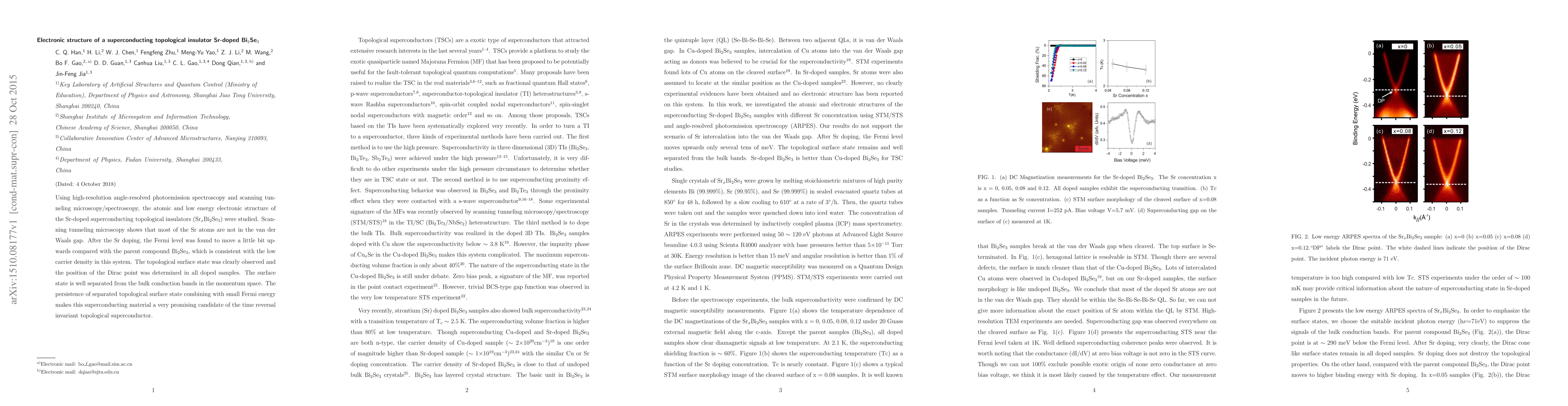 This study uses high-resolution angle-resolved photoemission spectroscopy and scanning tunneling microscopy to investigate the electronic structure of Sr-doped Bi2Se3, revealing a well-separated topological surface state and a Fermi level shift due to low carrier density. The material shows promise as a time reversal invariant topological superconductor.