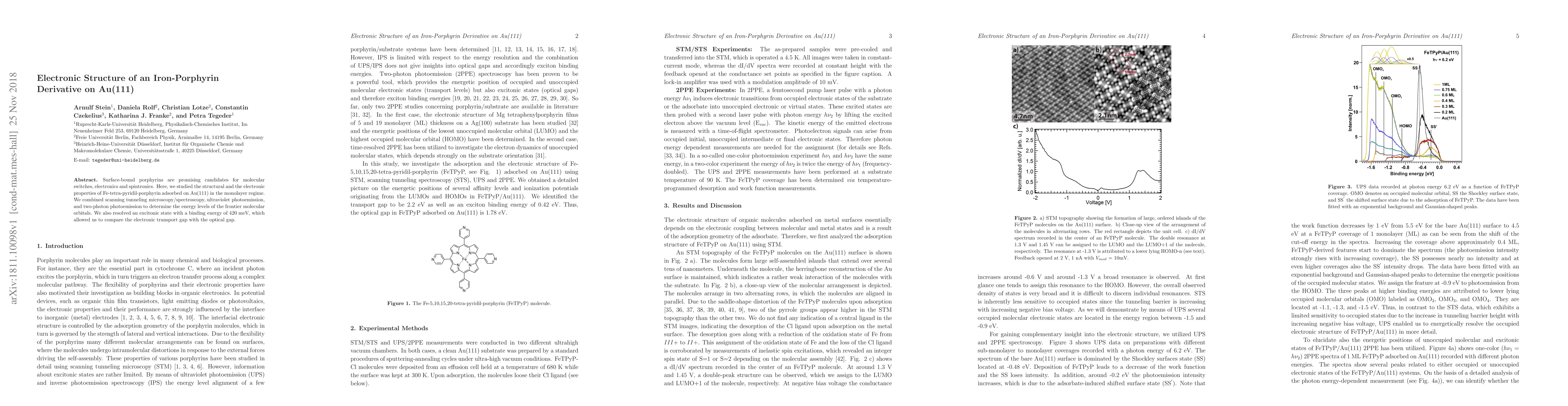 This study examines the Fe-tetra-pyridil-porphyrin molecule on Au(111) surface, utilizing STM/S, UV-photoemission, and two-photon photoemission. Key findings include determination of molecular orbital energy levels and identification of an excitonic state with a binding energy of 420 meV, enabling comparison of electronic transport and optical gaps.