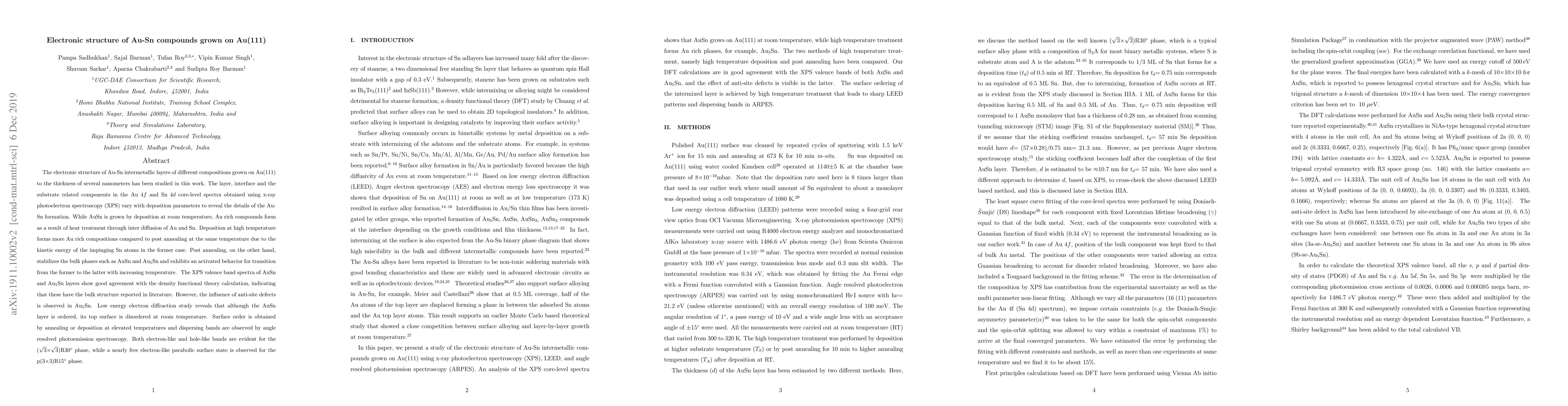 This study investigates the electronic structure of Au-Sn intermetallic layers on Au(111) using XPS, revealing compositional variations with deposition parameters. The formation of Au-Sn phases is influenced by deposition temperature and post annealing, with distinct surface ordering behaviors observed via electron diffraction and angle-resolved photoemission spectroscopy.