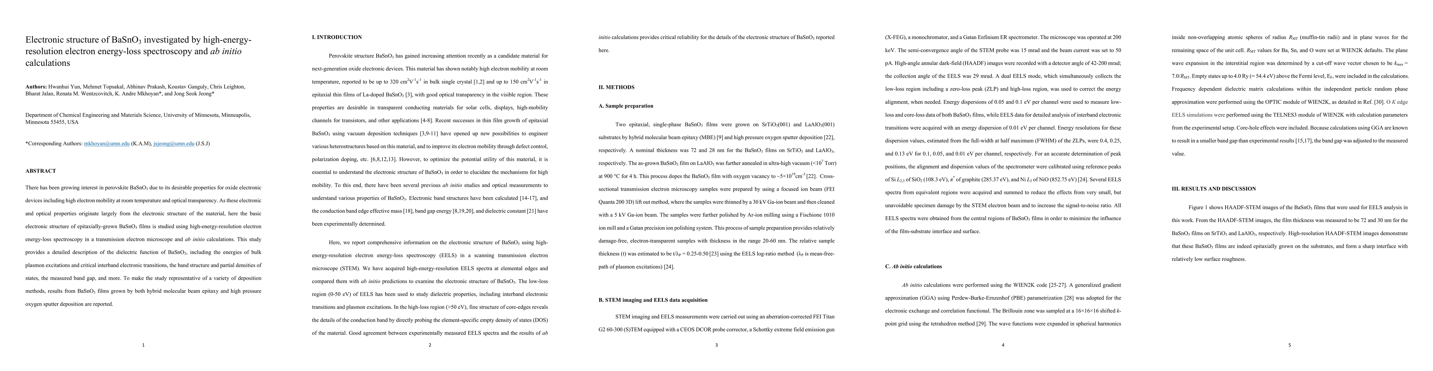 This study investigates the electronic structure of perovskite BaSnO3 using high-energy-resolution electron energy-loss spectroscopy and ab initio calculations, revealing its dielectric function, band structure, and band gap, which underpin its potential for oxide electronic devices. Results from two different growth methods are compared to ensure a comprehensive analysis.