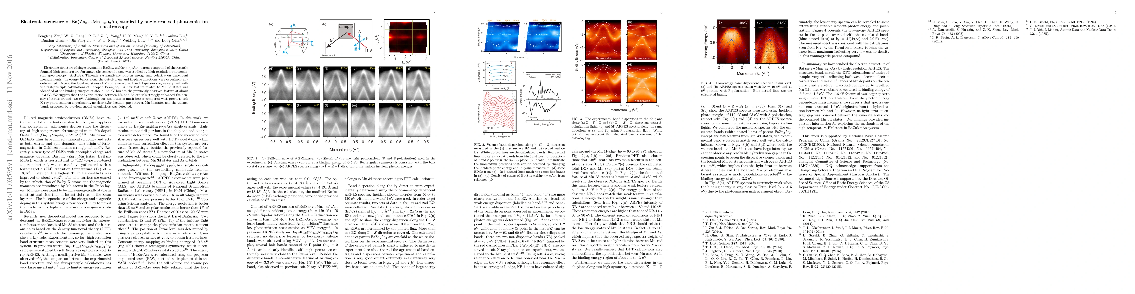 Electronic structure of single crystalline Ba(Zn$_{0.875}$Mn$_{0.125}$)$_{2}$As$_{2}$, parent compound of the recently founded high-temperature ferromagnetic semiconductor, was studied by high-resolution photoemission spectroscopy (ARPES). Through systematically photon energy and polarization dependent measurements, the energy bands along the out-of-plane and in-plane directions were experimentally determined. Except the localized states of Mn, the measured band dispersions agree very well with the first-principle calculations of undoped BaZn$_{2}$As$_{2}$. A new feature related to Mn 3d states was identified at the binding energies of about -1.6 eV besides the previously observed feature at about -3.3 eV. We suggest that the hybridization between Mn and As orbitals strongly enhanced the density of states around -1.6 eV. Although our resolution is much better compared with previous soft X-ray photoemission experiments, no clear hybridization gap between Mn 3d states and the valence bands proposed by previous model calculations was detected.